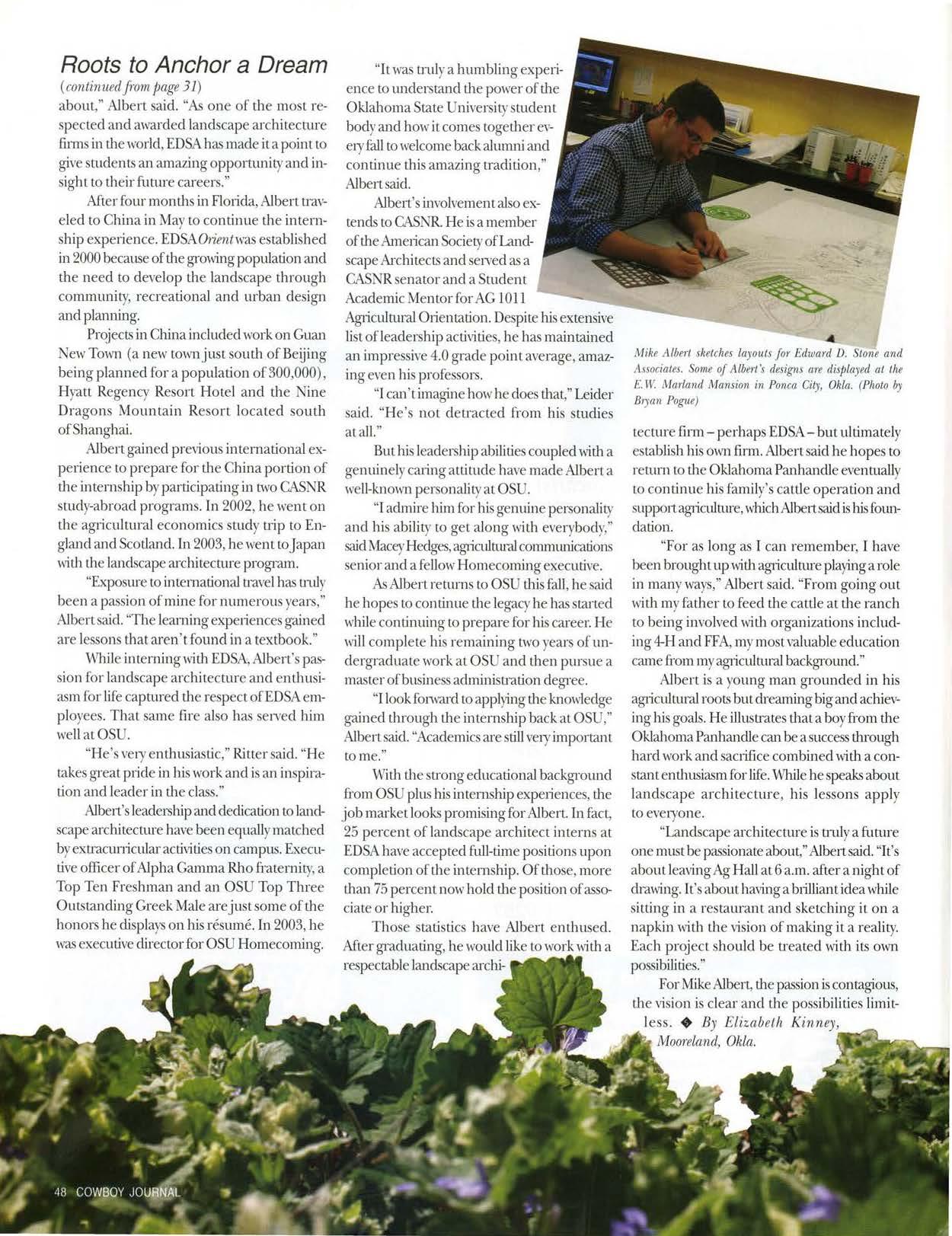 tecture firm - perhaps EDSA- but ultimately establishhis own firm.Albertsaid he hopes to return to tl1eOklahomaPanhandle eventually LOcontinue his family'scattle operation and supportagiiculture,whichAlbert.saidishisfoundation.