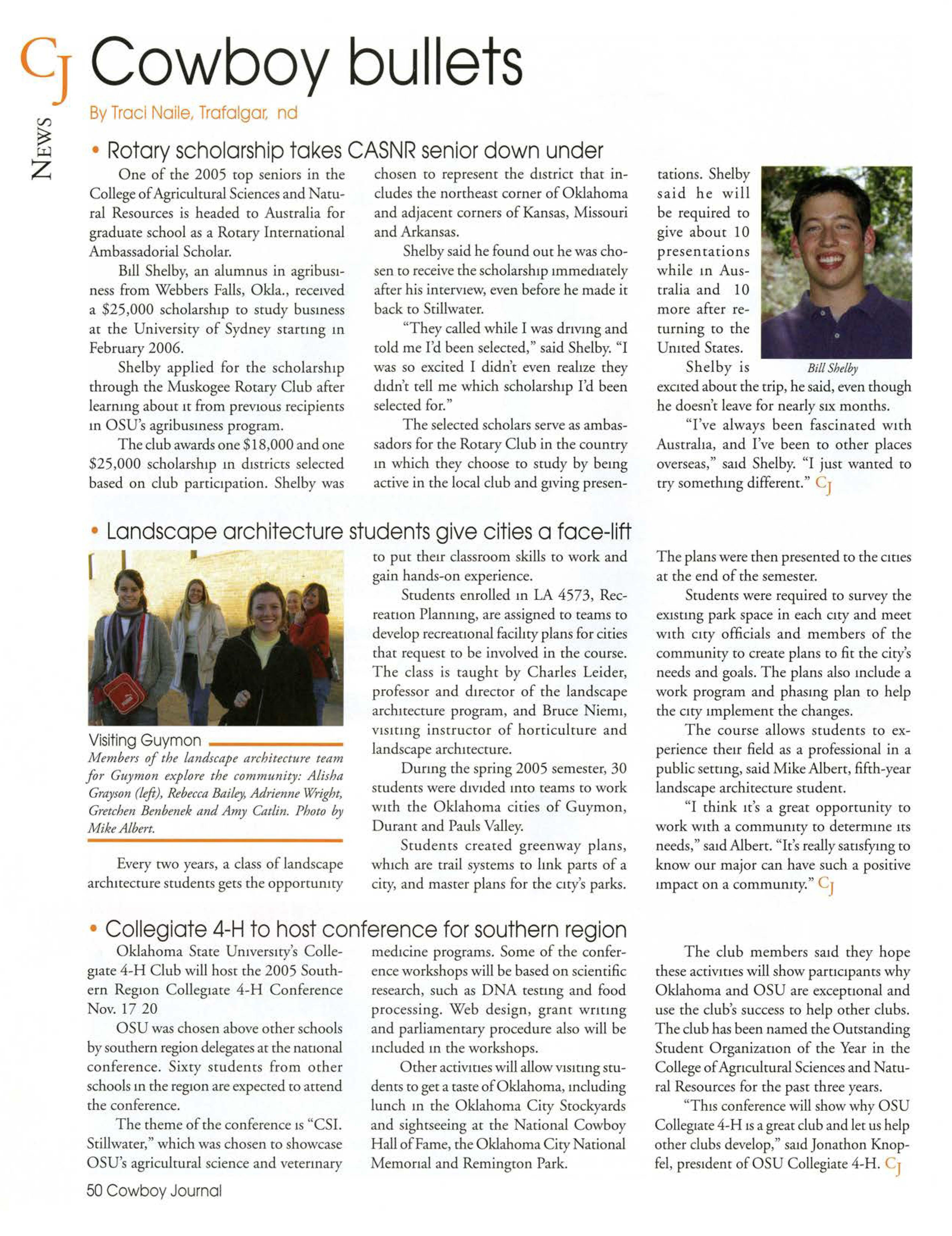 Bi.IIShelby, an alumnus in agribusiness from Webbers Falls, Okla. received a $25 000 scholarship to study busmes at the University of Sydney scamng m February 2006.