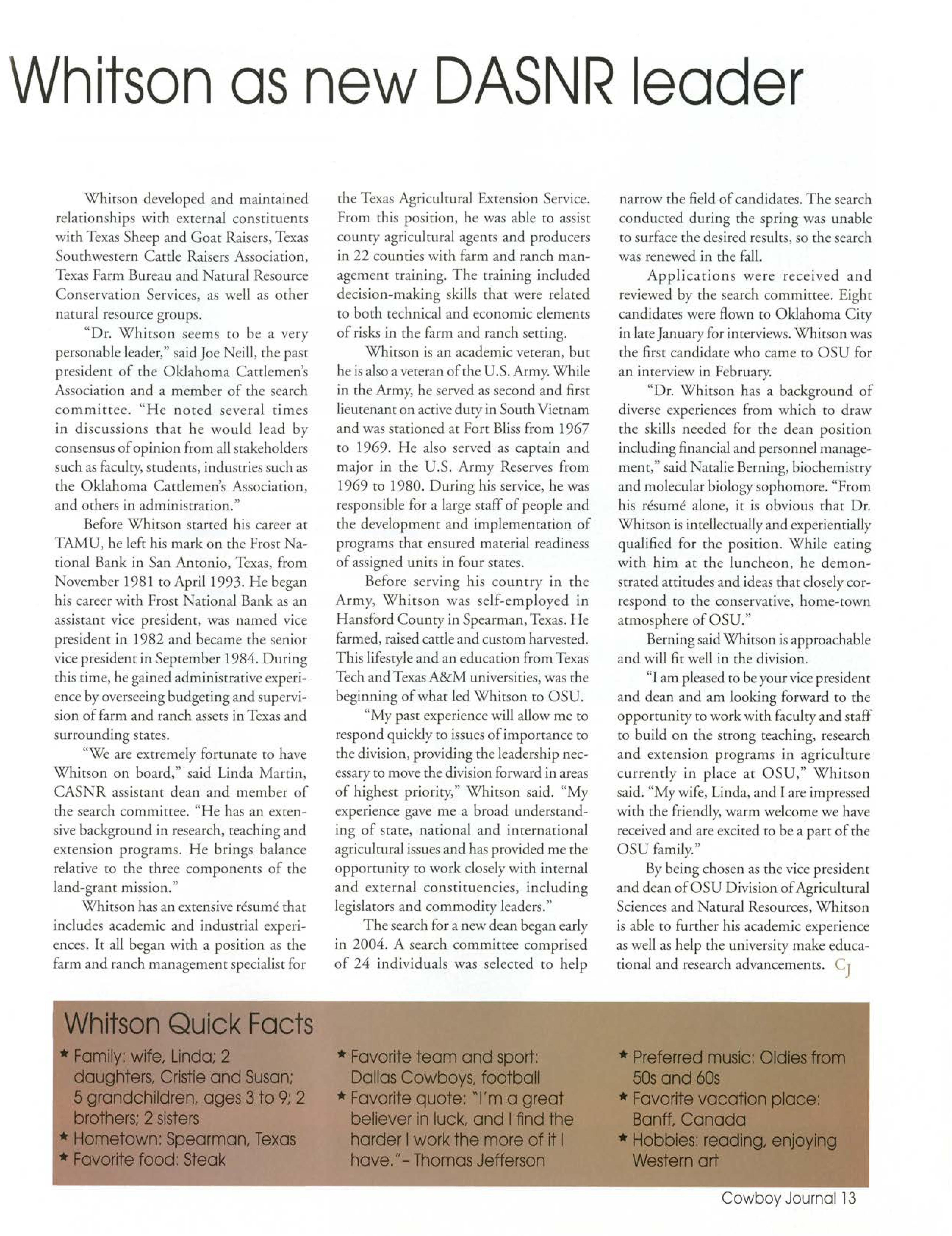 12 OSU selects Whitson as new DAS R leader