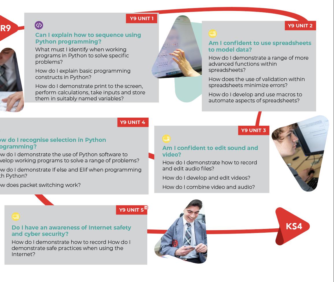 Students will continue their three-year journey learning a range of knowledge and practical skills allowing them to expand their confidence, application and creativity as well as giving them skills that they will be able to use throughout their lives. The diverse range of skills will also support them in their other subjects to be able to access, present and consolidate their IT skills. They will also gain a firm foundation for KS4 and KS5 options later in their school career.