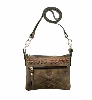 This convenient and versatile combination bag is the perfect grab-and-go for the “essentials only” kind of cowgirl. Its front flap opens to reveal a full wallet with 2 clear Id windows, 4 card slots, 2 open compartments, a zipper coin compartment, and a pen holder, all made of genuine leather.