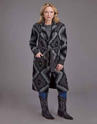 WOMEN’S GREY AZTEC DUSTER SWEATER * SHAWL COLLAR * SELF TIE BELT AT WAIST * FRONT PATCH POCKETS stetson.com