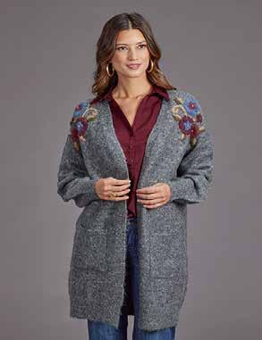 WOMEN’S GREY MID LENGTH CARDIGAN SWEATER * OPEN FRONT, LONG SLEEVES, PATCH POCKETS, AND HEM ALL RIBBED * EMBROIDERED Stetson.com