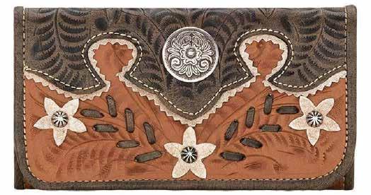 The popular tri-fold wallets feature hand tooled designs, eye catching conchos, and an exterior zipper coin pocket. The full leather interior includes 12 credit card spaces, 1 clear ID space, multiple currency pockets, and a checkbook flap. www.americanwest.cc