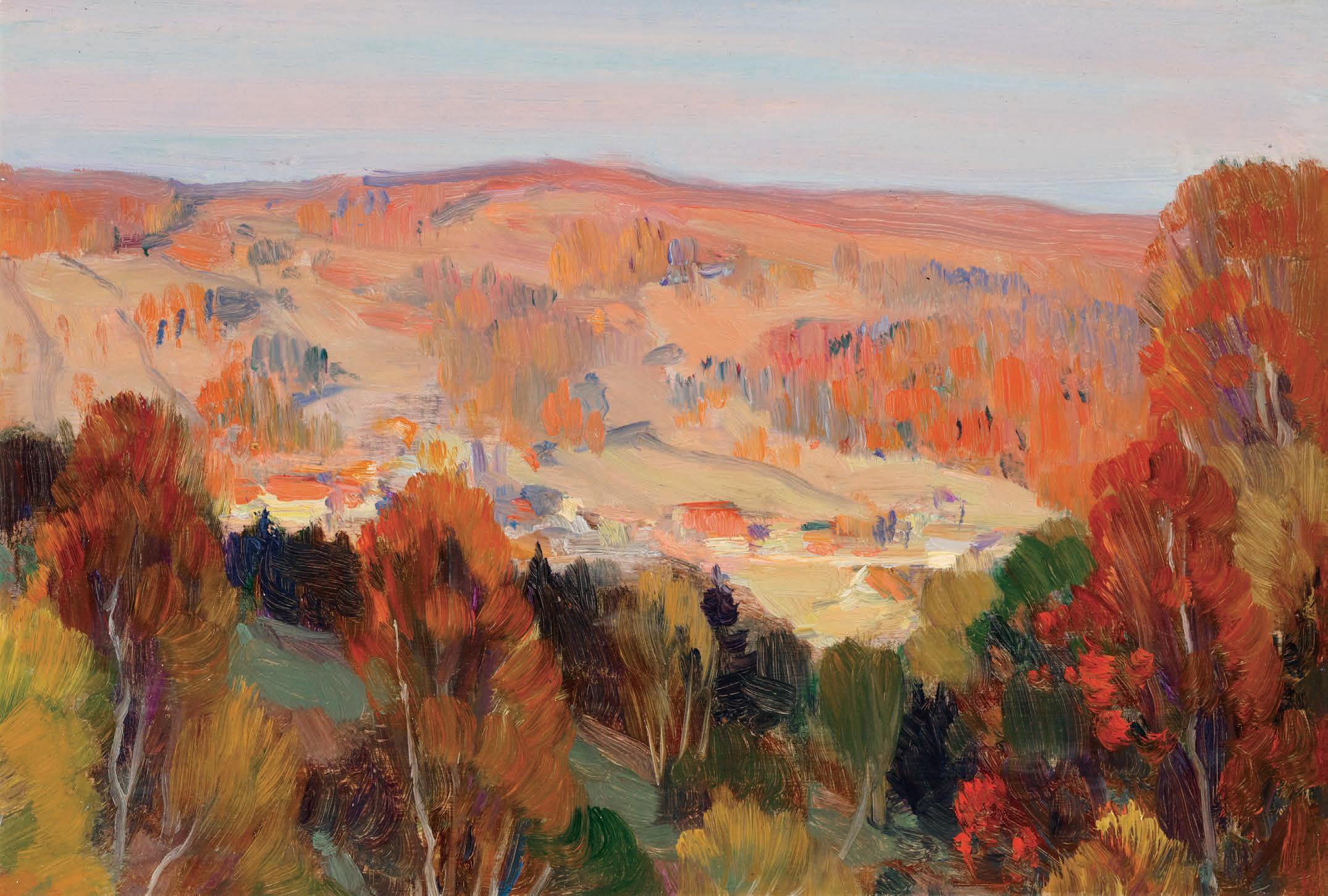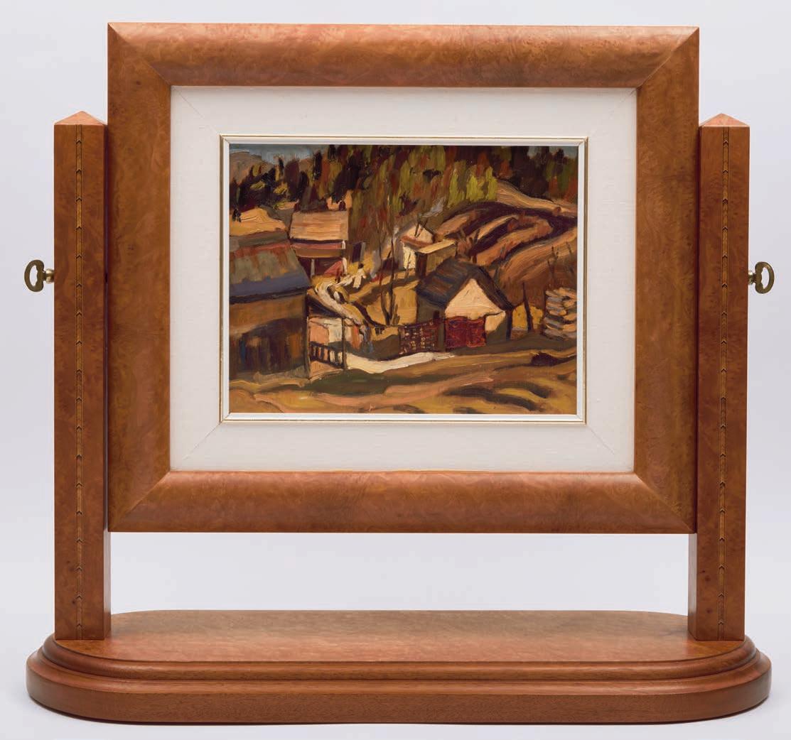 Banting was very familiar with farm life. !e youngest of six children, Banting grew up as part of a hard-working and prosperous farming family in the Alliston area, 60 kilometres north of Toronto. With bold swaths of paint, this double-sided oil encapsulates the artist's a % nity for tight compositions. Akin to Jackson's renderings of villages and landscapes, the importance of the daily lives of the inhabitants are equal to the natural landscape. Sleigh tracks, wisps of chimney smoke and " rewood piles all signal village life and labour integral to the development of rural villages and industry within Canada. Here, Banting paints this ideal subject - capturing the crisp autumn colours and mood of the changing seasons.
