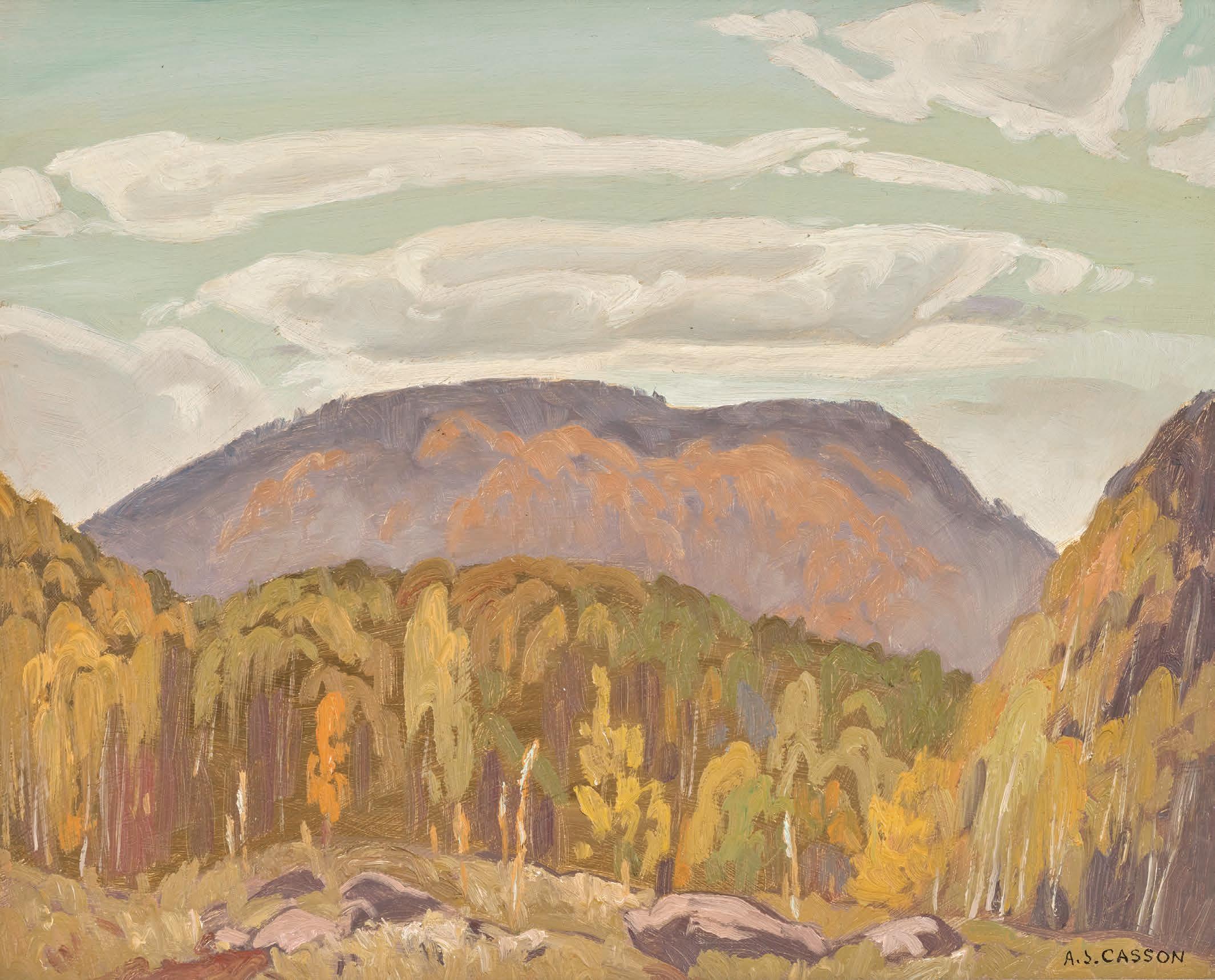 signed and dated 1933 lower left; signed with artist's Toronto address with extensive inscriptions on the stretcher, including the original title, “Hills, Haliburton”