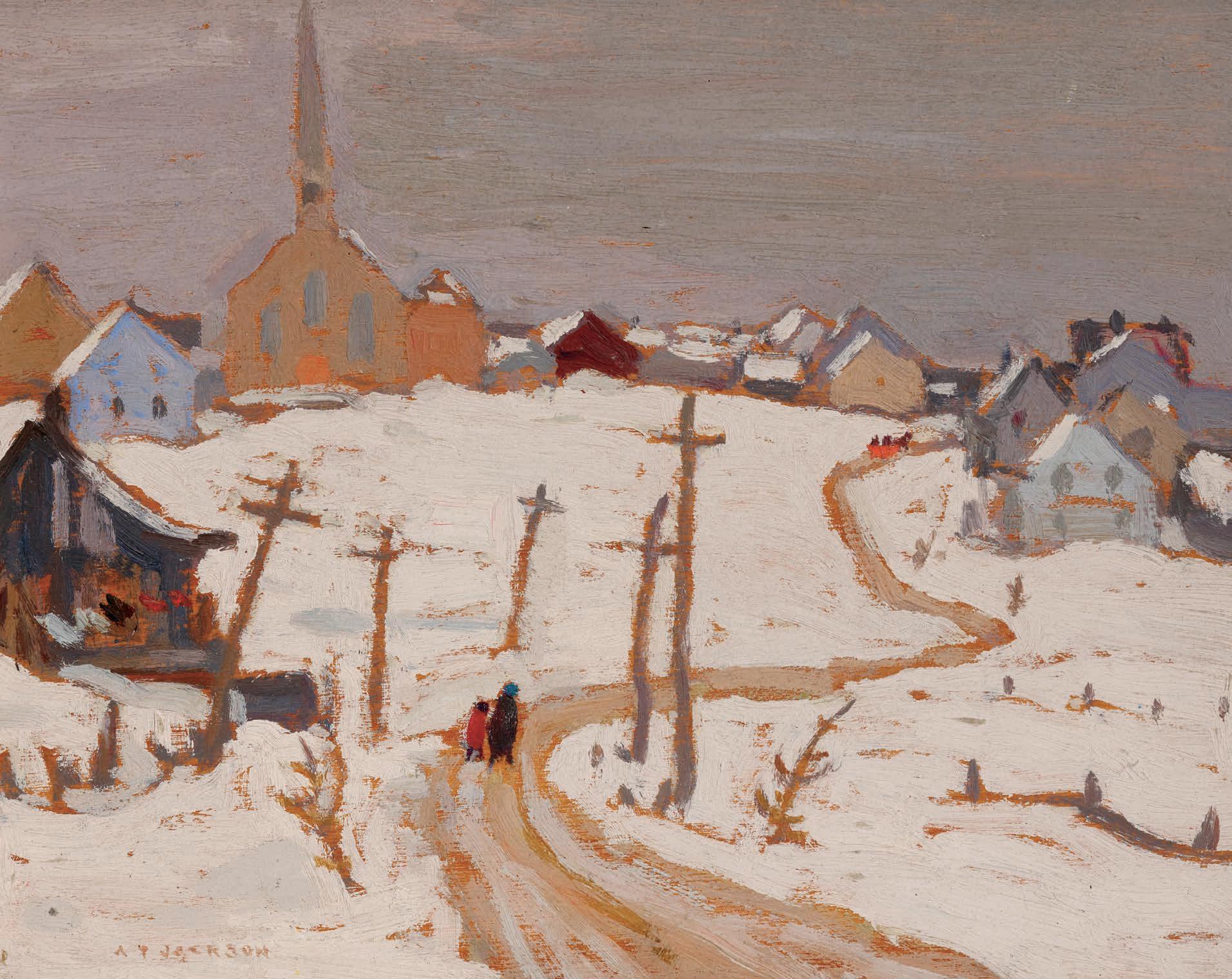 A.Y. Jackson spent much of his career travelling throughout Quebec, visiting small villages along the north and south shores of the St. Lawrence River. !ese small, rural towns attracted Jackson and his companions because they retained the traditional way of life during a time when society was becoming increasingly modernized and