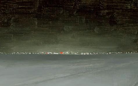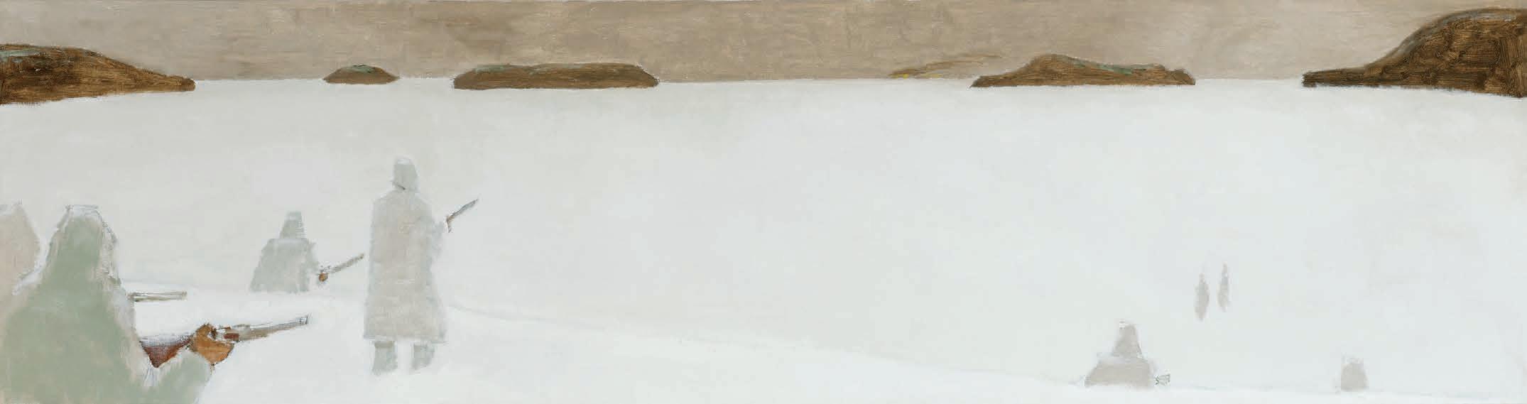 ! is painting portrays a small boy glimpsed through the doorway of a barn. !e child has accessed a tin and covered his mitts in the substance contained within. Kurelek leaves the interpretation of the picture open as the title references the fog surrounding the barn, which captivates the young child.