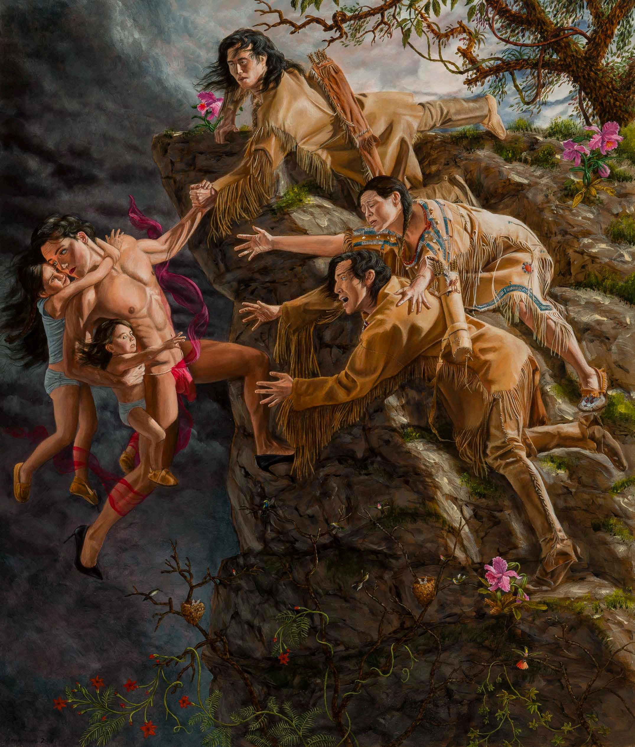!e whale in the foreground arches protectively around the younger. In the distance, the Flora S. Nickerson $ounders in the unforgiving waters as its crew and passengers row to safety. !e sorrow of the loss is ingrained in the solemn down-turned expressions of the men aboard the lifeboat. Mirroring what is taking place below water, a father protectively holds his young boy above water. !e sublime power of the composition highlights the notion of one's mortality within a moment of loss, compassion and comfort.