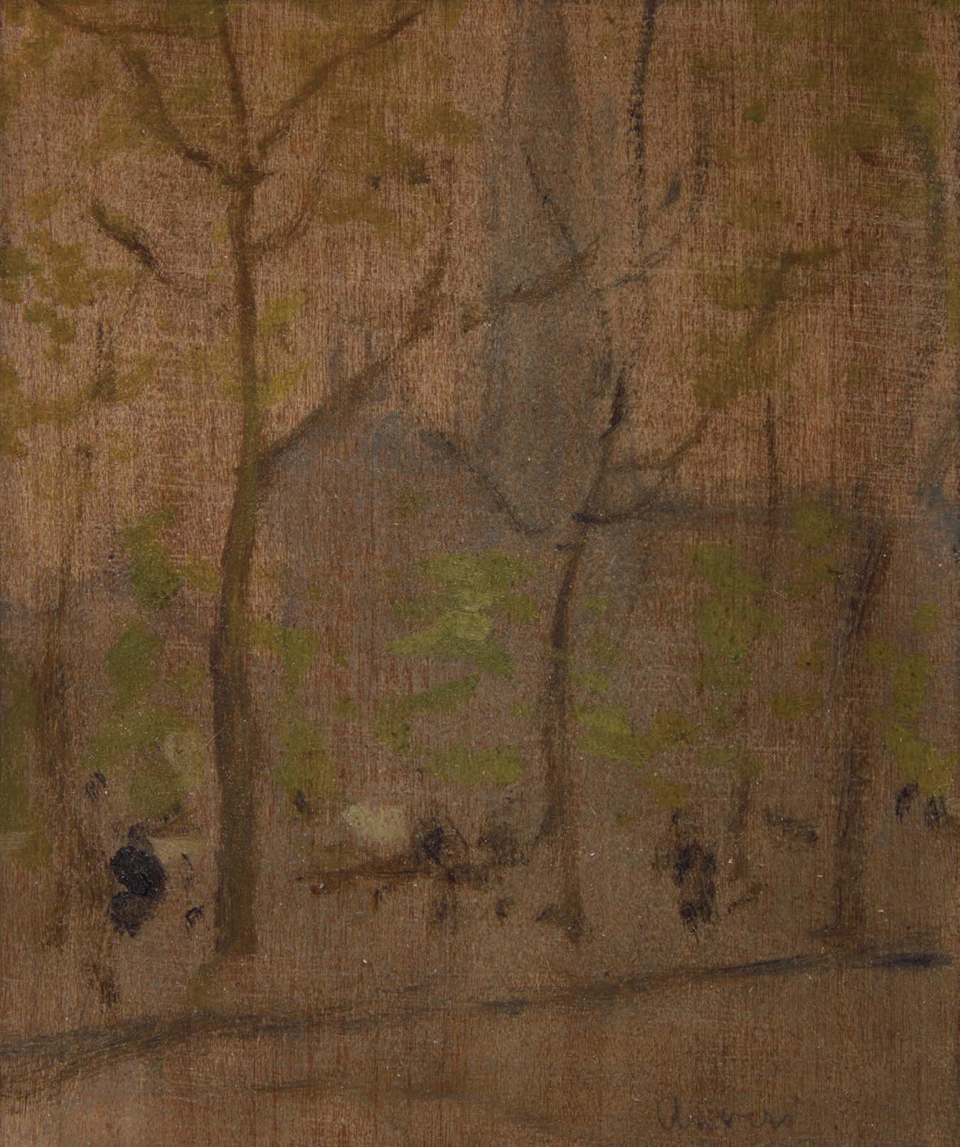 Frederick Varley’s stylized landscapes underscore his skill in translating the essence of the subject through a warm and subtle palette. His personal use of colour became a trademark of his paintings and one that is still used by so many artists today, such was the lasting in $uence of his work. Here, the artist depicts a view of a church, seen through a screen of mostly bare trees. Taking into account the title of the work, the building can be identi "ed as the Doon Presbyterian Church, with its distinct large Gothic window in the tower. !e church opened in 1854 and still stands today in the Kitchener suburb of Doon.