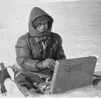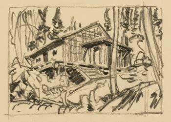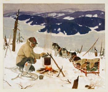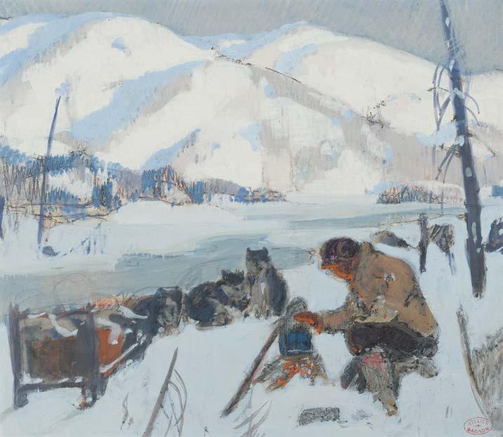 Study for "François Paradis Camping in the Snow" (Maria Chapdelaine), circa 1929 mixed media on paper stamped "Atelier Gagnon" lower right; titled and dated circa 1929 on a label and certified by Lucile Rodier Gagnon as "Trappeur et ses chiens" (no. 810) on the reverse 7 ins x 8 ins; 17.8 cms x 20.3 cms