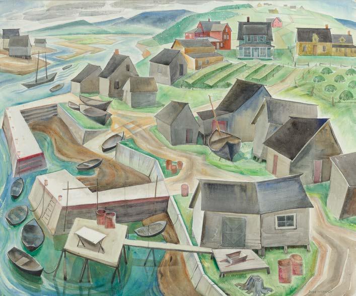 During the 1930s, Arthur Lismer travelled along Canada’s eastern seaboard, sketching harbours, fishing communities, and maritime industries. In Lismer’s Seal Cove, Grand Manan, N.B., the clustered wooden buildings, wharves, and fishing gear evoke a site that, around 1930, was at the height of its economic activity, with structures and labour practices closely integrated into the coastal landscape.