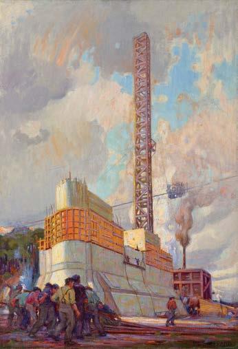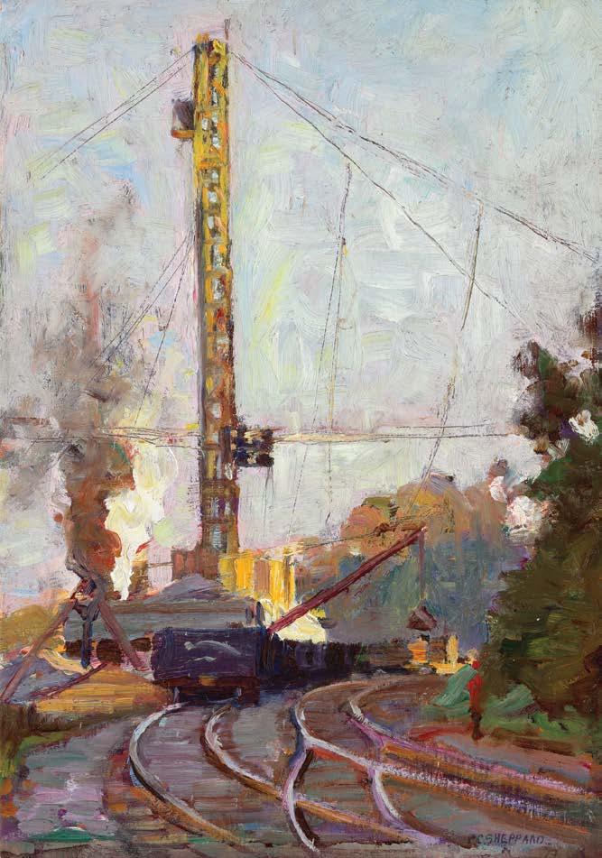 In this sketch, as in his other industrial scenes, Sheppard responded not merely to the structure itself but to what it represented: energy, expansion and optimism. He constructed the composition through sweeping, sinuous railway tracks whose converging lines accelerate the viewer into the heart of the construction site. A string of open-topped freight cars curves along the rails, reinforcing the sense of motion and industrial momentum. Smoke rises from below the crane, dissolving into a pale, scumbled sky. Against this haze, shafts of sunlight catch the yellow lattice of the derrick tower and flare through drifting vapour. The cumulative effect is one of kinetic optimism: a city in the act of building itself, rendered in swift, responsive paint.