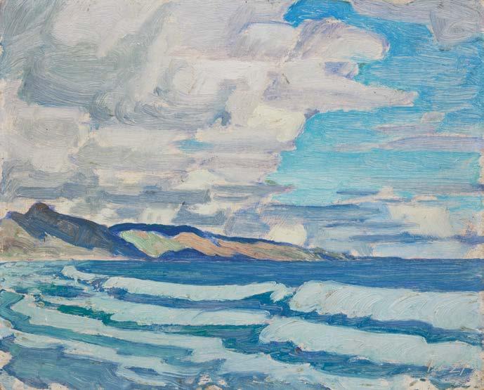 Following a mild stroke in late 1931, the artist travelled with his wife to Barbados, where he benefited from the warm climate during the winter months. MacDonald produced a number of oil sketches during his three-month stay, observing this new locale with his keen sense of visual structure and pattern. Sky and sea tend to dominate his landscape sketches of the period. In Surf, Barbados, bands of shifting blues undulate across the composition. Of the Barbados sketches, art historian Paul Duval wrote, “they prove, once again, MacDonald’s ability to quickly adjust to a new landscape environment...In the Barbados, as in Nova Scotia, he luxuriated in the sense of freedom he always found by the sea.”