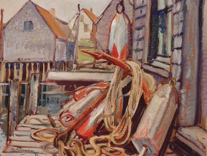 Lismer’s choice of subject aligns with a broader Canadian modernist interest in regional identity, but here the emphasis shifts from untouched nature to a vernacular, working environment shaped by human hands. Rather than rendering the scene with photographic clarity, Lismer simplifies and distorts shapes—boats, ropes, and buildings twist into rhythmic, almost animated lines. Thick, directional brushwork and an earthy palette—punctuated by flashes of red and ochre—create a sense of tactile immediacy, suggesting both the materiality of the fishing equipment and the hard labour that shaped this small coastal community.