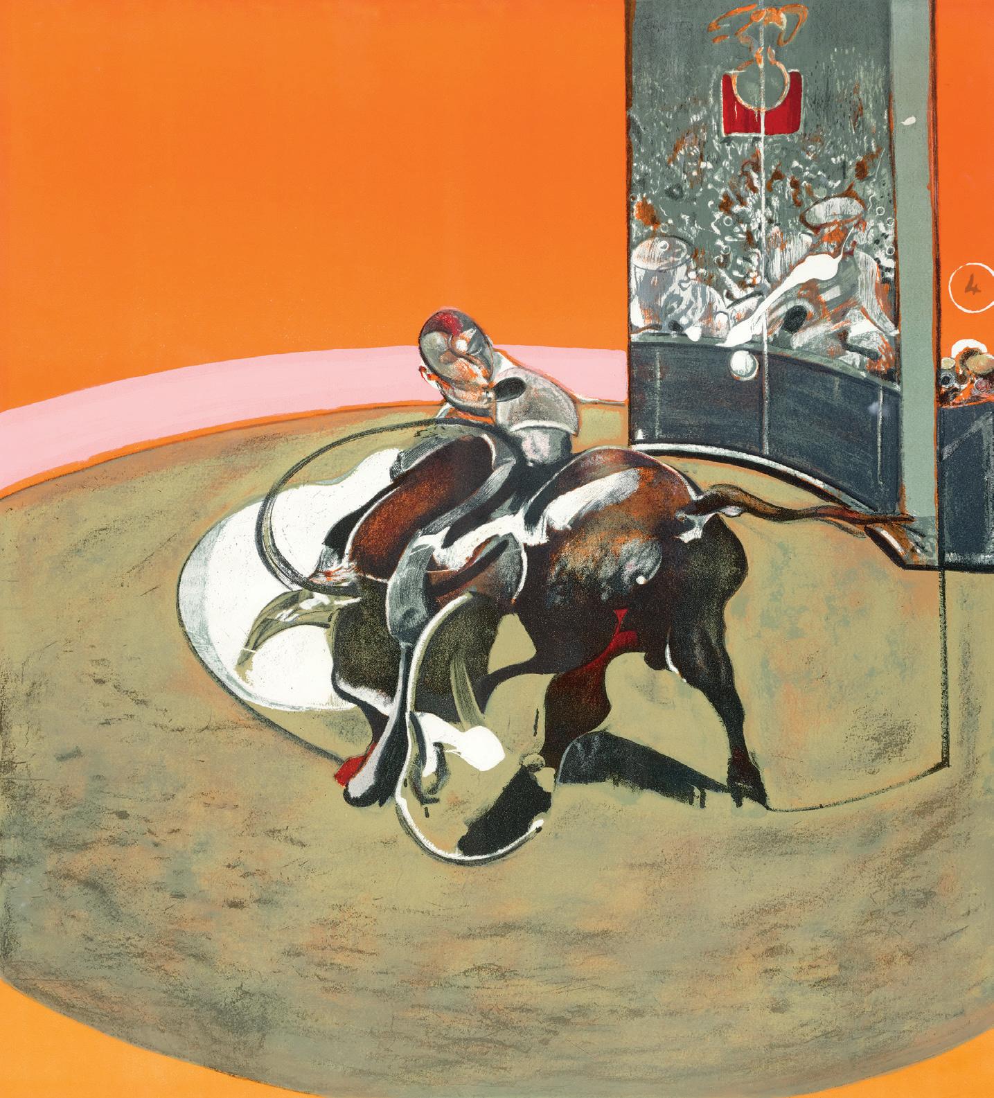 T is work was inspired by Francis Bacon’s triptych of bull f ght paintings from 1969, in which he celebrates this ancient ritual that remains popular in Spain, Portugal, and southern France. T is colour lithograph was initially issued as the main image on the poster advertising Bacon’s retrospective of paintings in October 1971 at the
