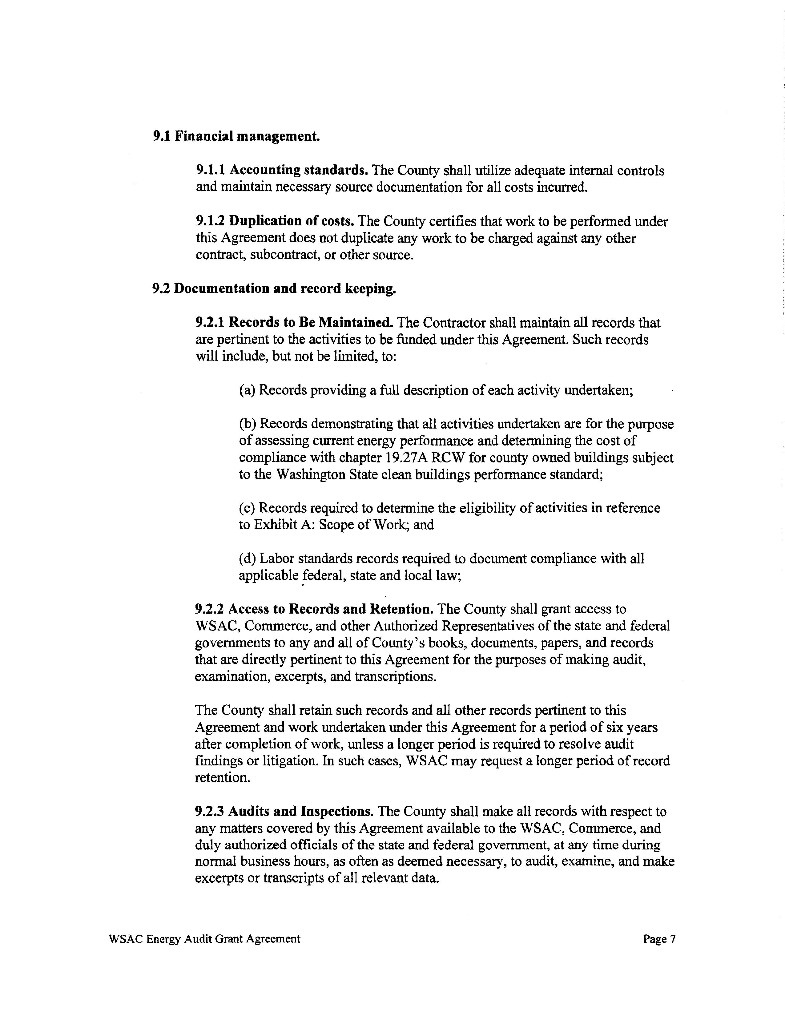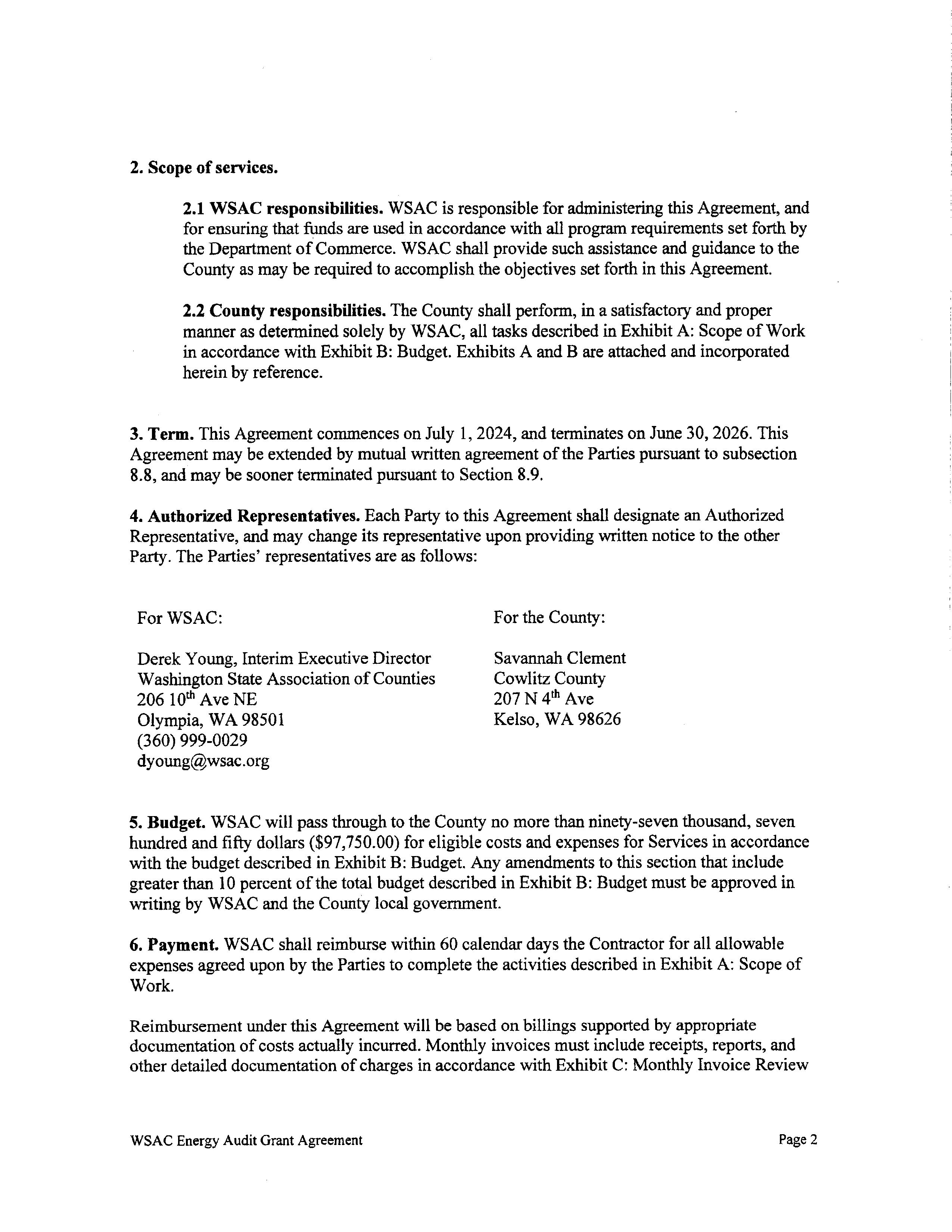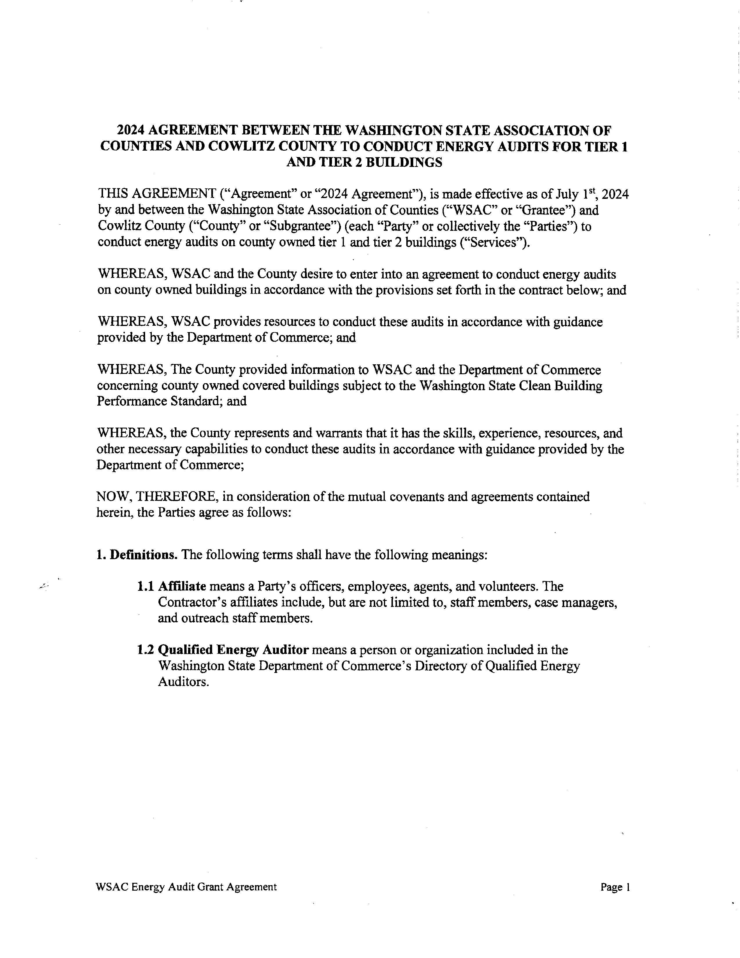 This agreement between Cowlitz County, Department of Commerce, and the Washington State Association of Counties, is to provide energy audit reimbursement resources for the County to comply with the Clean Buildings Performance Standards concerning county owned covered buildings. The County has already completed the energy audit for the Cowlitz County Hall of Justice campus and will be seeking reimbursement up to $97,750.00 as stated in the agreement.