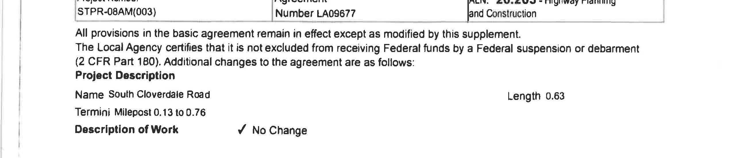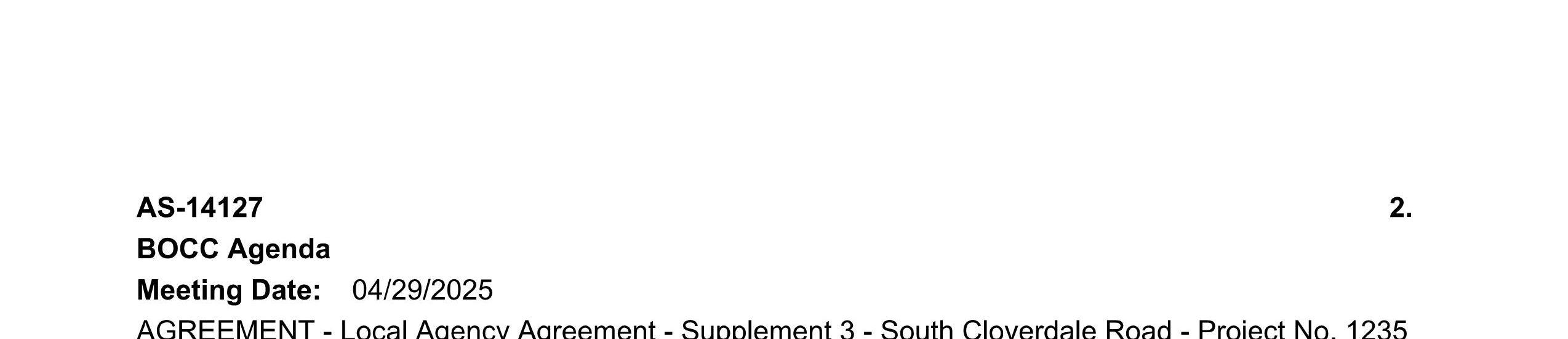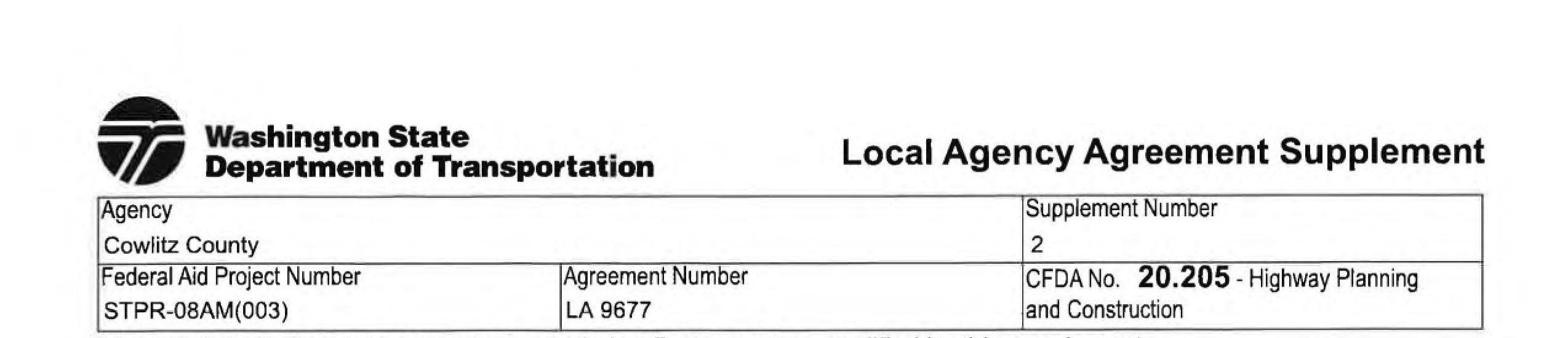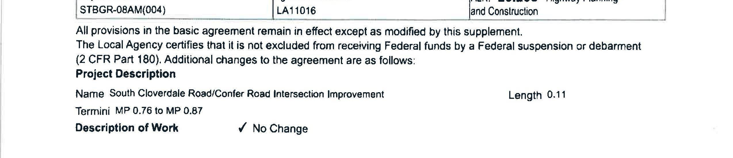 2. Local Agency Agreement Supplement No. 2 for the South Cloverdale Road/Confer Road Intersection Improvement Project to remove the Kalama Water Main work from federal funding to local construction funds. (14240)