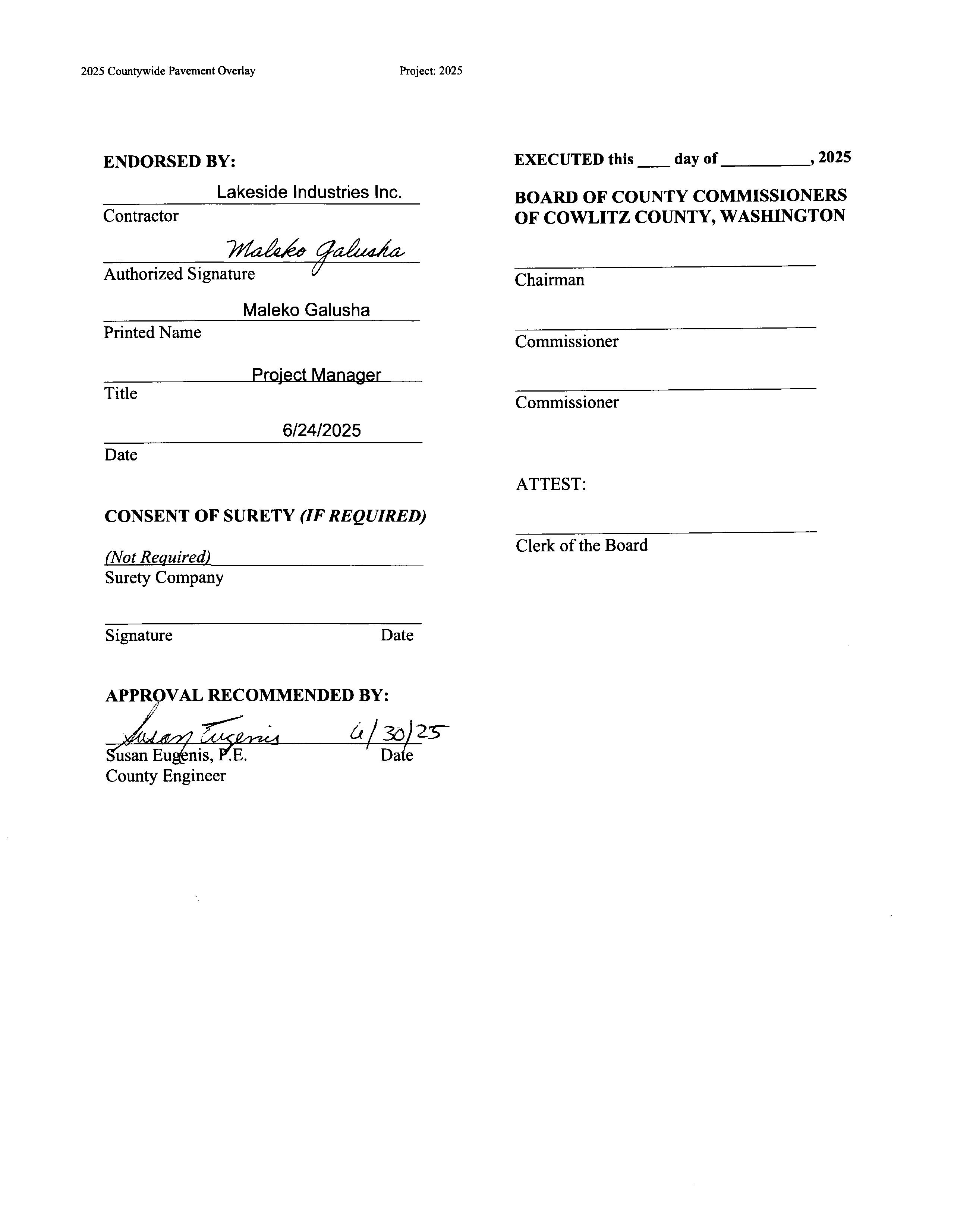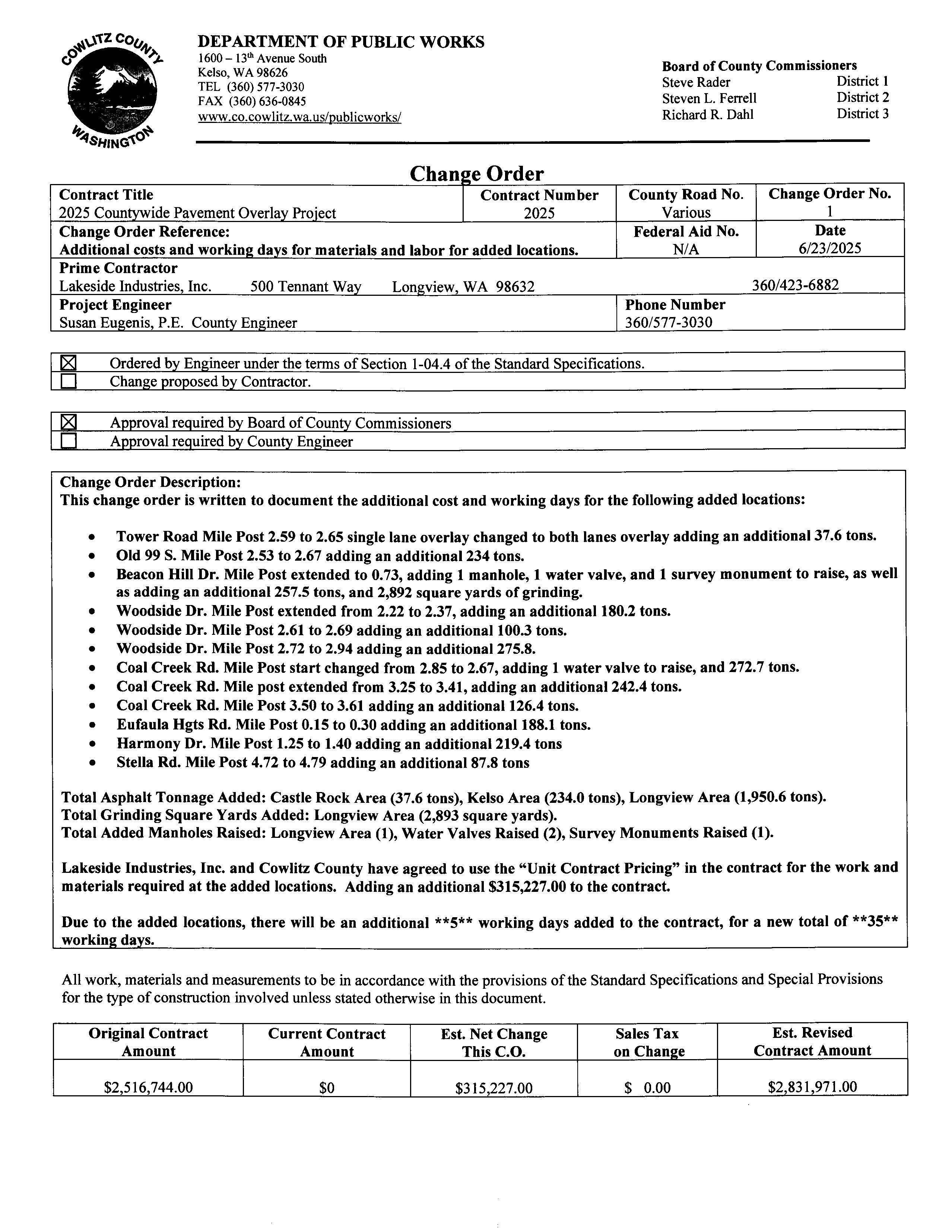 7. Change Order No. 1 to the Contract with Lakeside Industries for the 2025 Countywide Pavement Overlay Project for Additional Locations including Materials and Labor. The increase is $315,227 for a total of $2,831,971. (14243)