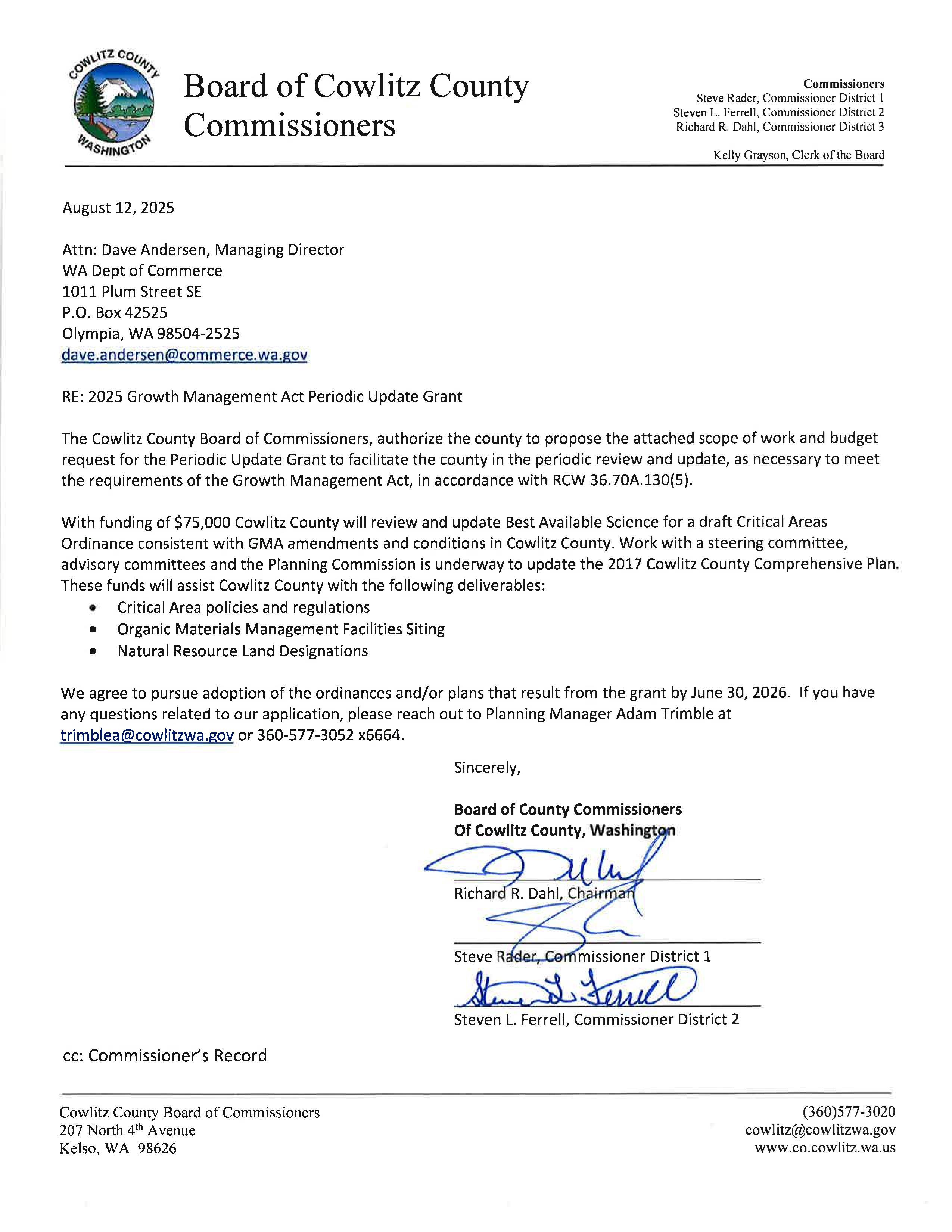 f. Signed letter dated 8/12/2025 to Dave Anderson, Managing Director, WA Dept of Commerce regarding the 2025 Growth Management Act Periodic Update Grant. (14308)