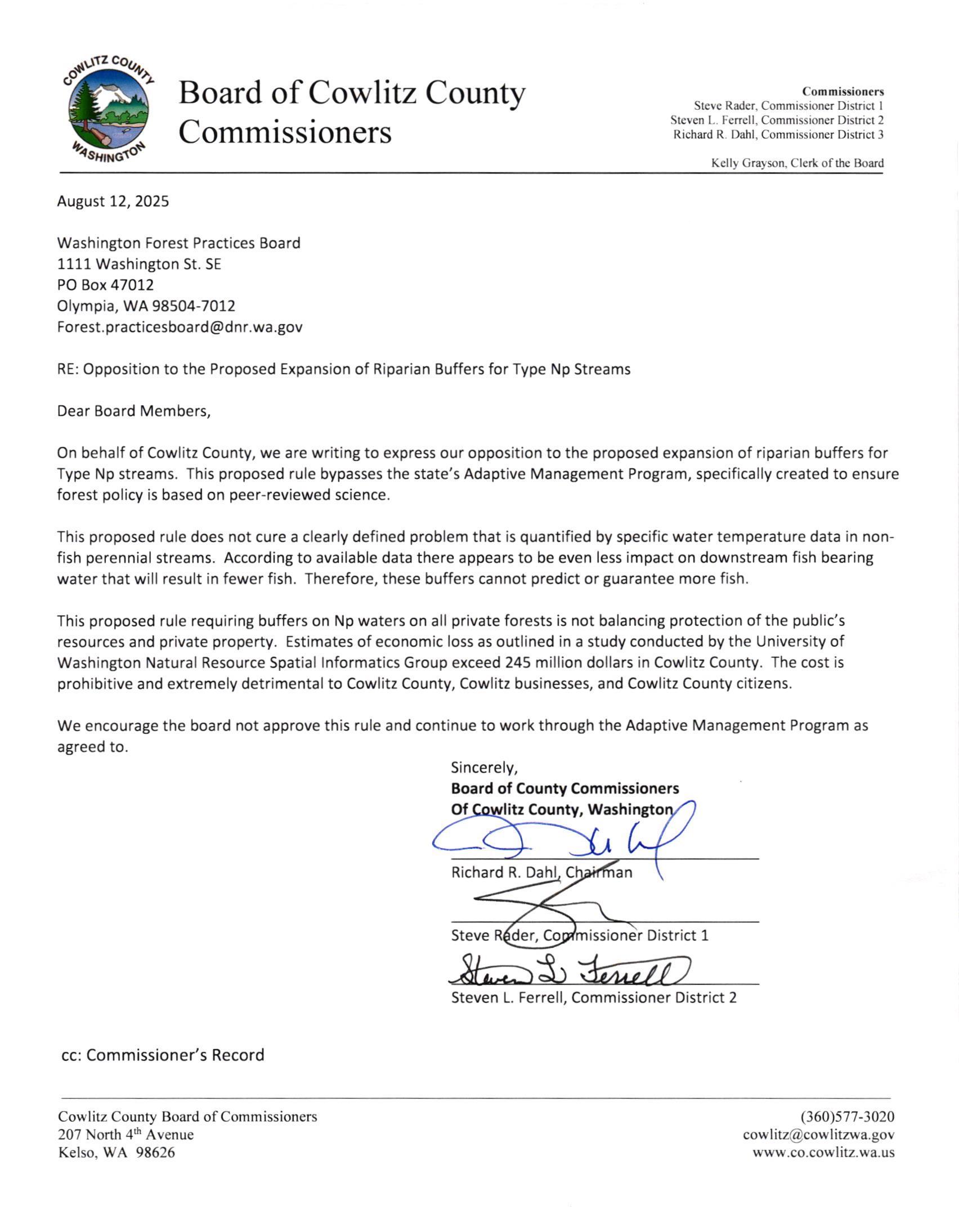 d. Letter dated 08/12/2025 to the Washington Forest Practices Board regarding in opposition of the Proposed Expansion of Riparian Buffers for Type Np Streams. (14302)