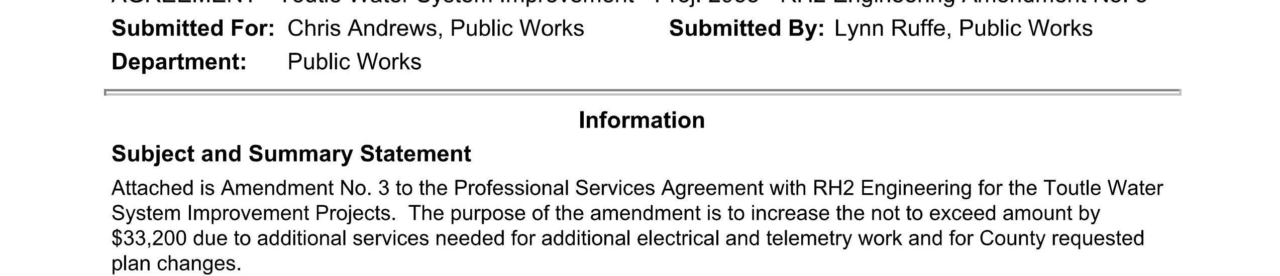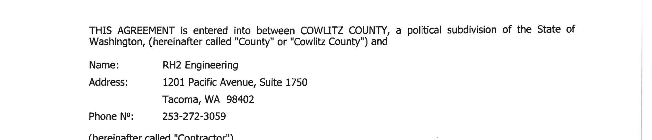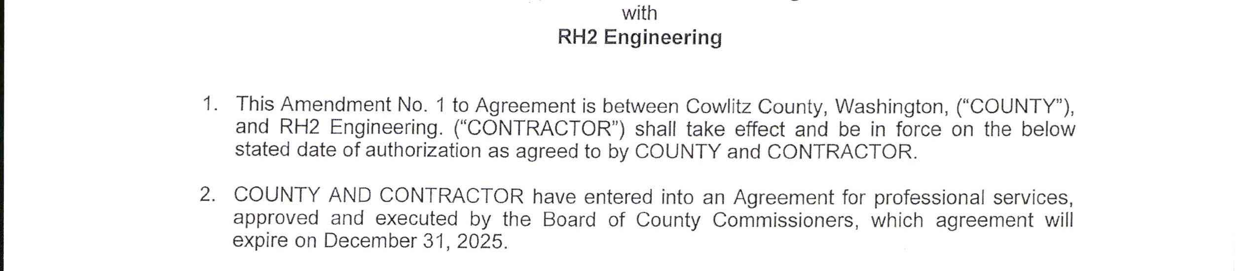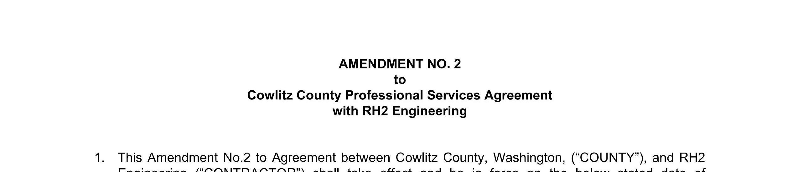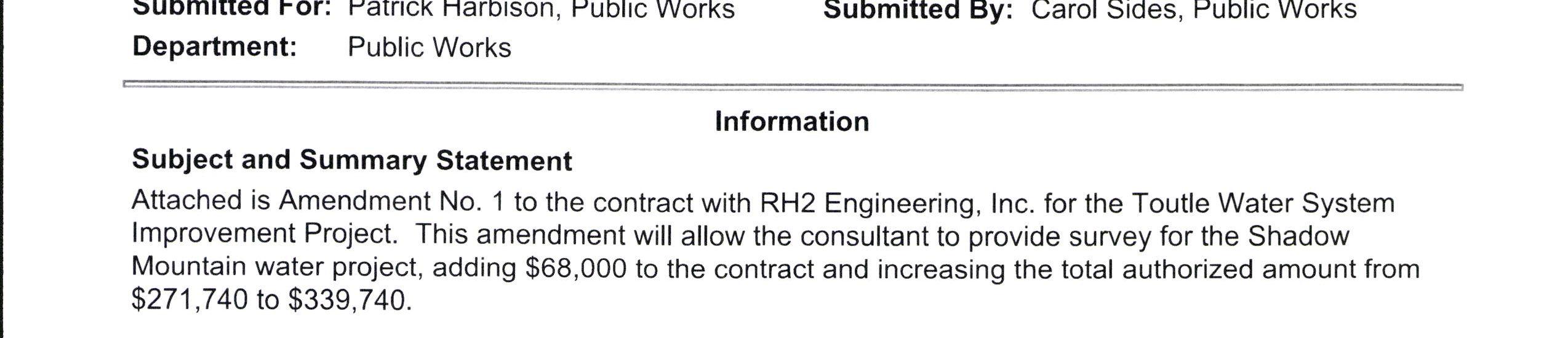 6. Amendment No. 5 to the Professional Services Agreement with RH2 Engineering for the Toutle Water System Improvement Projects for additional services during construction. The amendment will increase the not-to-exceed amount by $7,403, for a total of $507,289. (14336)
