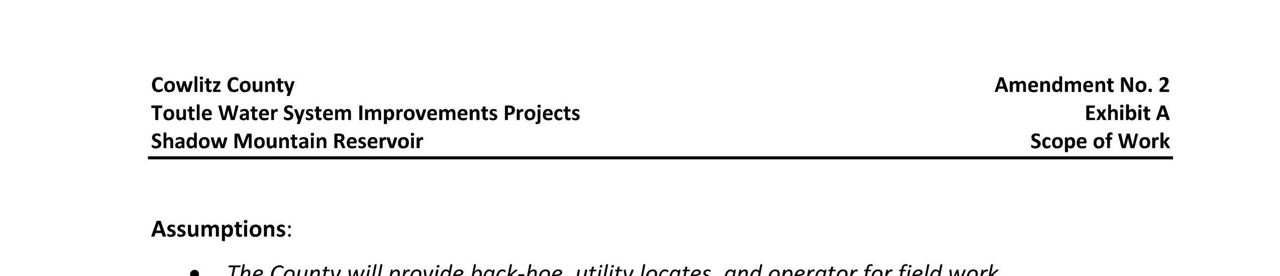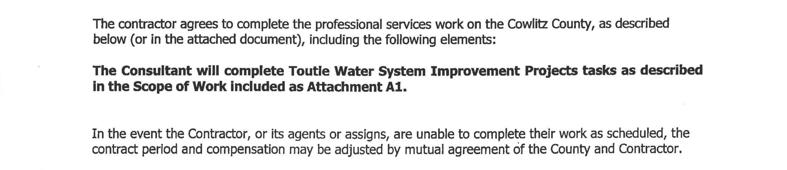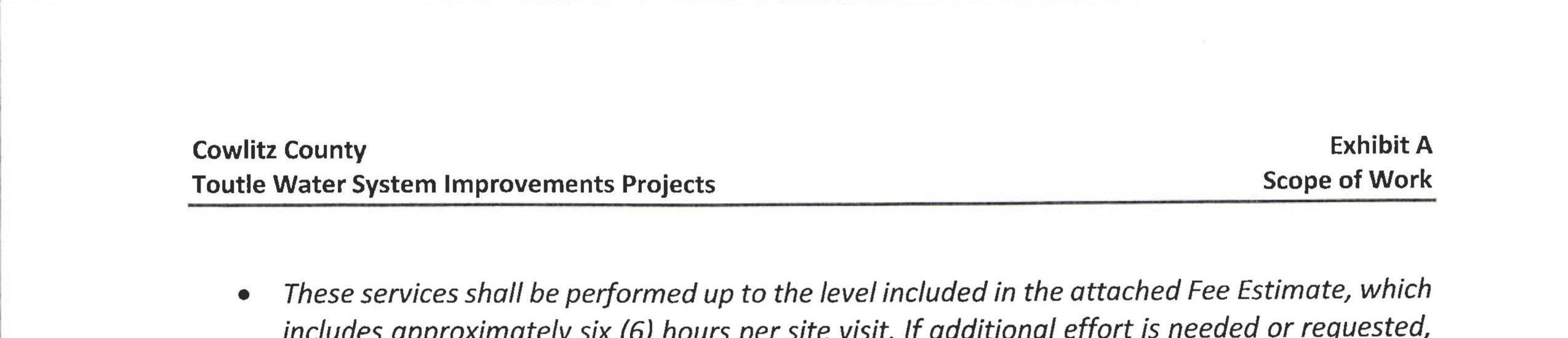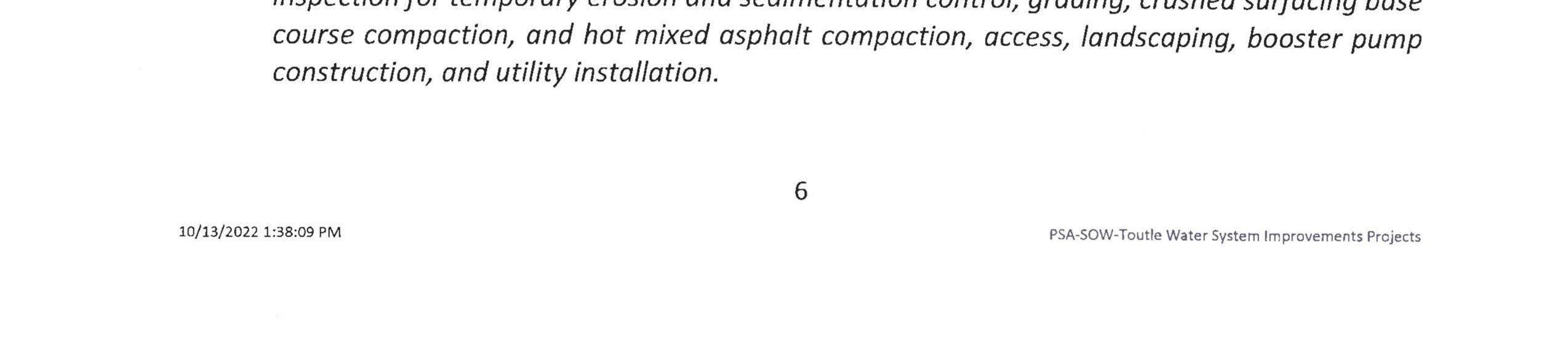 6. Amendment No. 5 to the Professional Services Agreement with RH2 Engineering for the Toutle Water System Improvement Projects for additional services during construction. The amendment will increase the not-to-exceed amount by $7,403, for a total of $507,289. (14336)