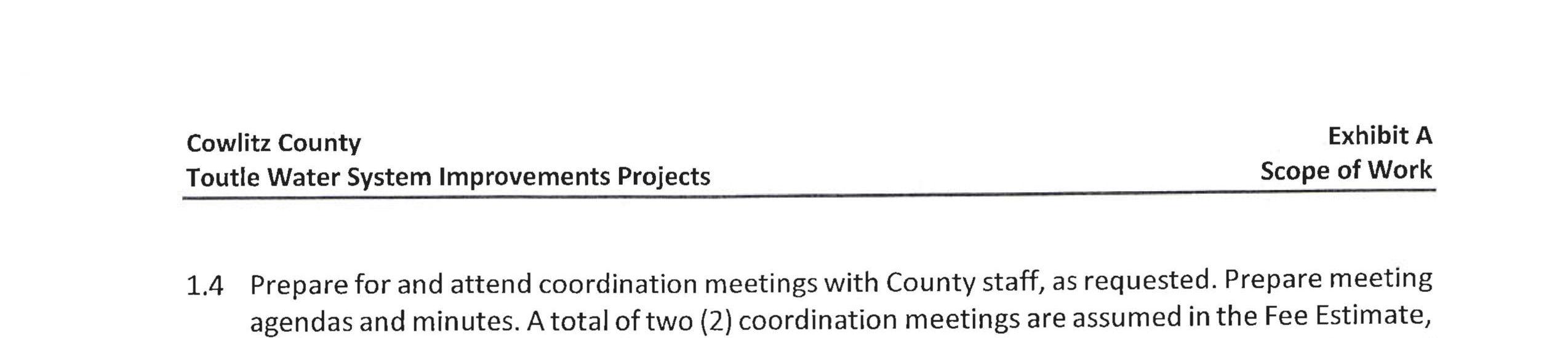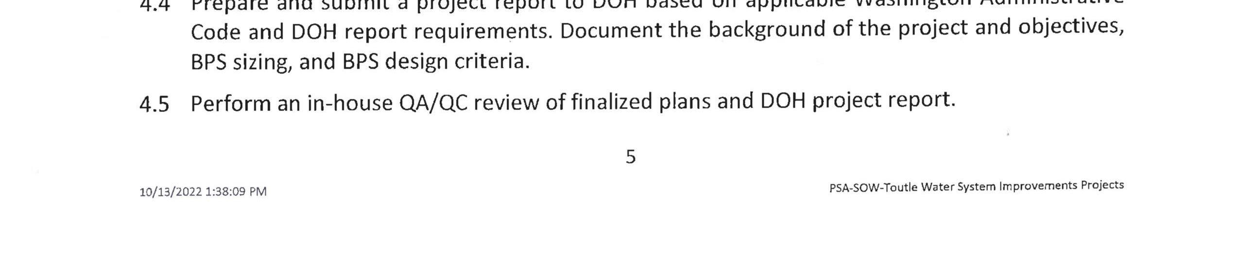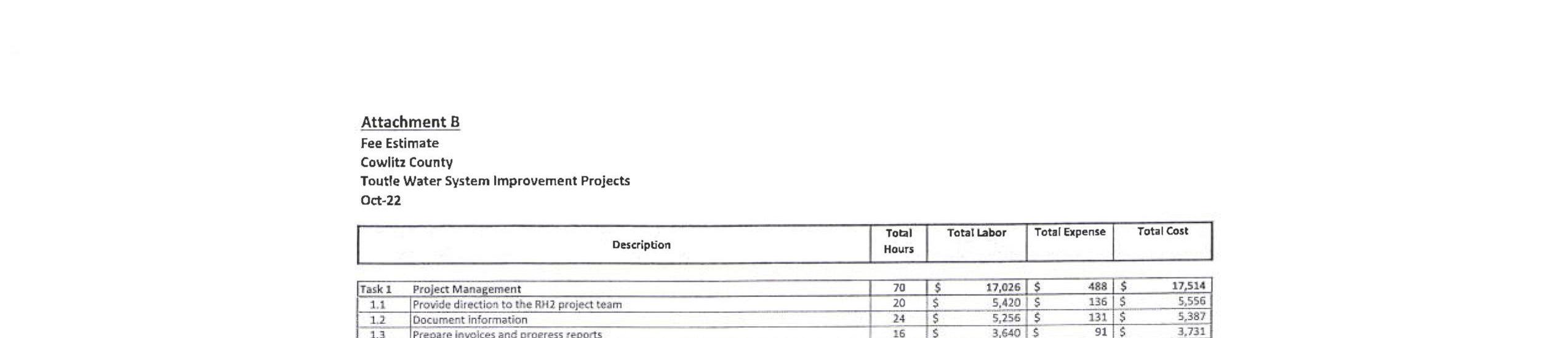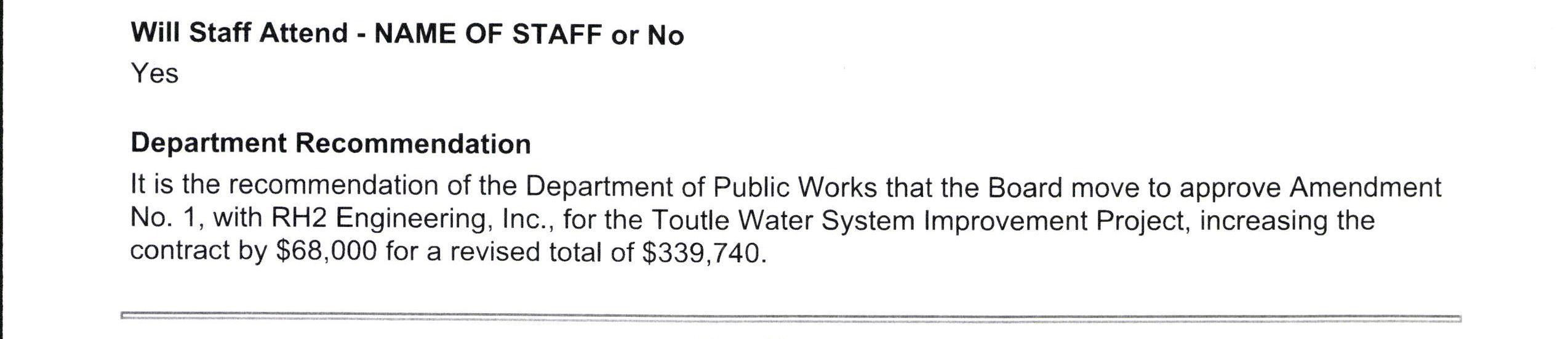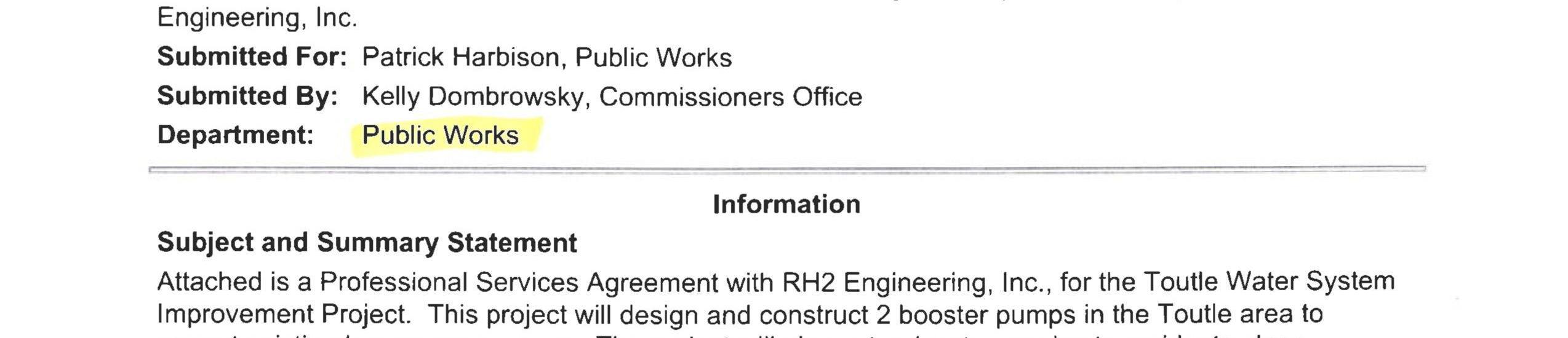 6. Amendment No. 5 to the Professional Services Agreement with RH2 Engineering for the Toutle Water System Improvement Projects for additional services during construction. The amendment will increase the not-to-exceed amount by $7,403, for a total of $507,289. (14336)