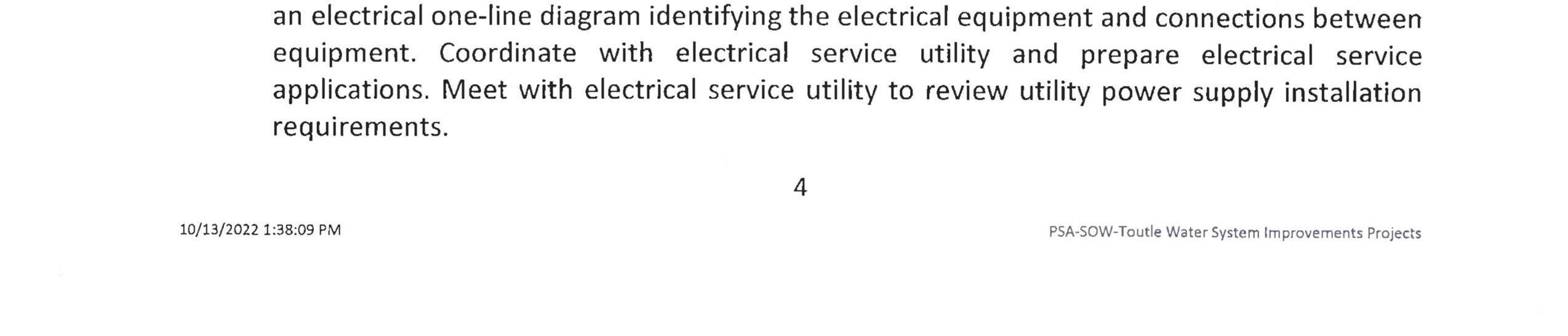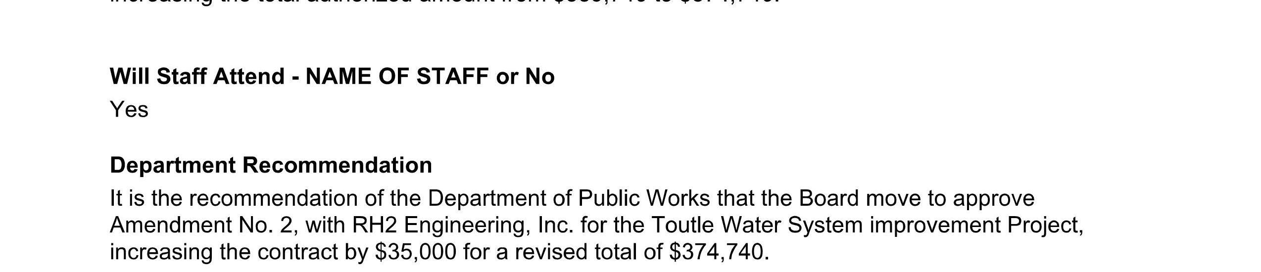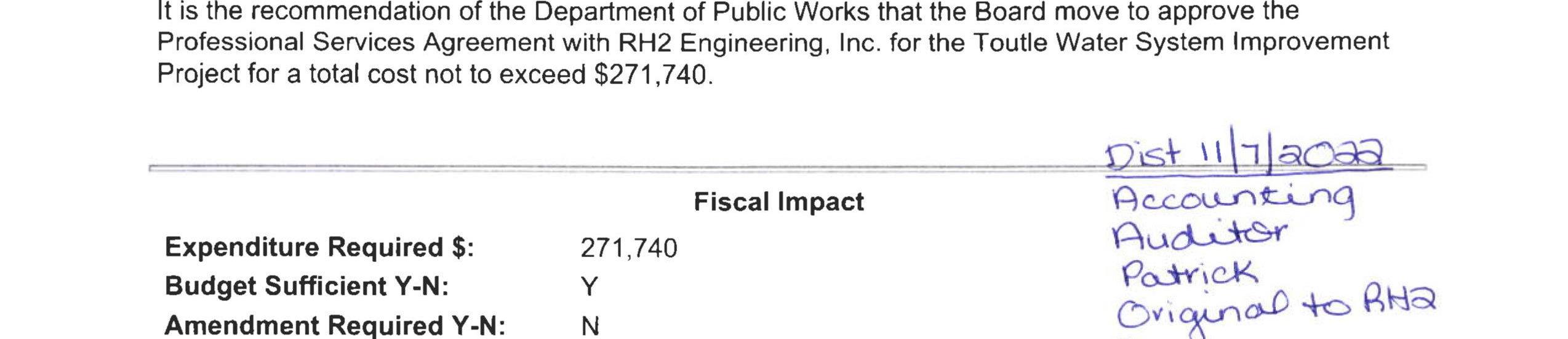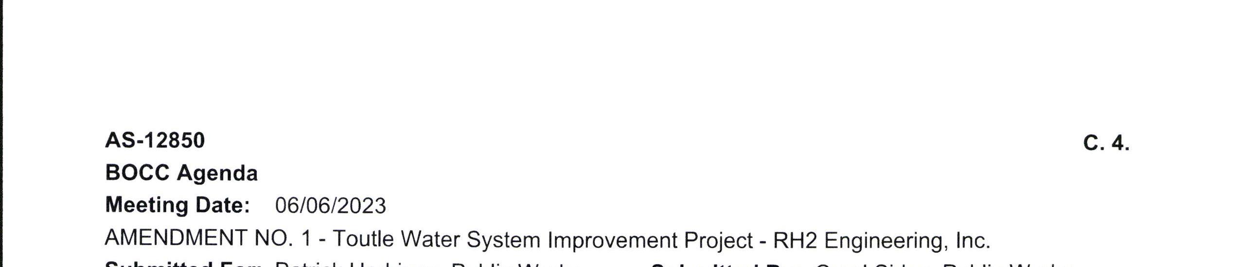 6. Amendment No. 5 to the Professional Services Agreement with RH2 Engineering for the Toutle Water System Improvement Projects for additional services during construction. The amendment will increase the not-to-exceed amount by $7,403, for a total of $507,289. (14336)