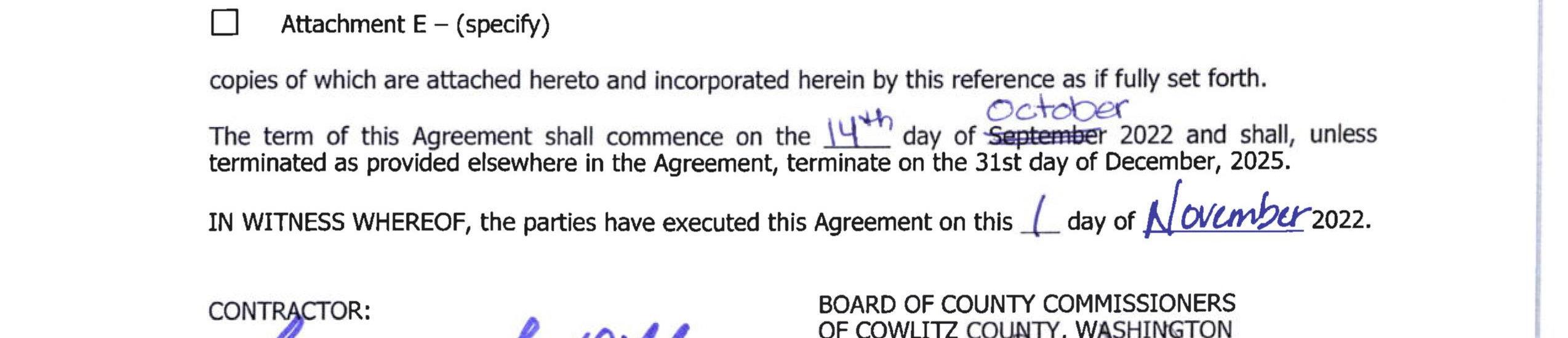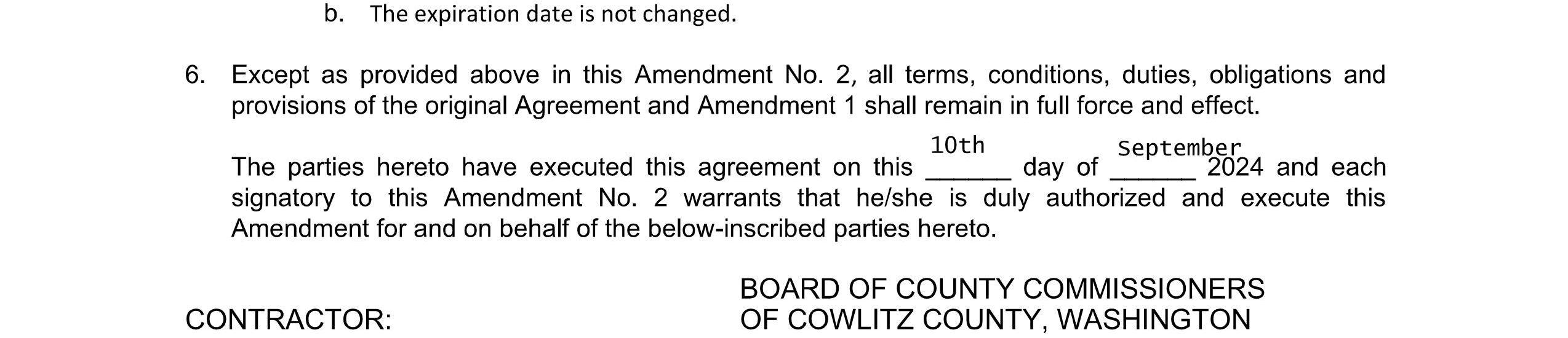 This Fourth Amendment (“Amendment”) is made and entered into as of this 5th day of September, 2025, by and between Cowlitz County, a political subdivision of the State of Washington, (“County”), and Everhealth, LLC (“Contractor”)