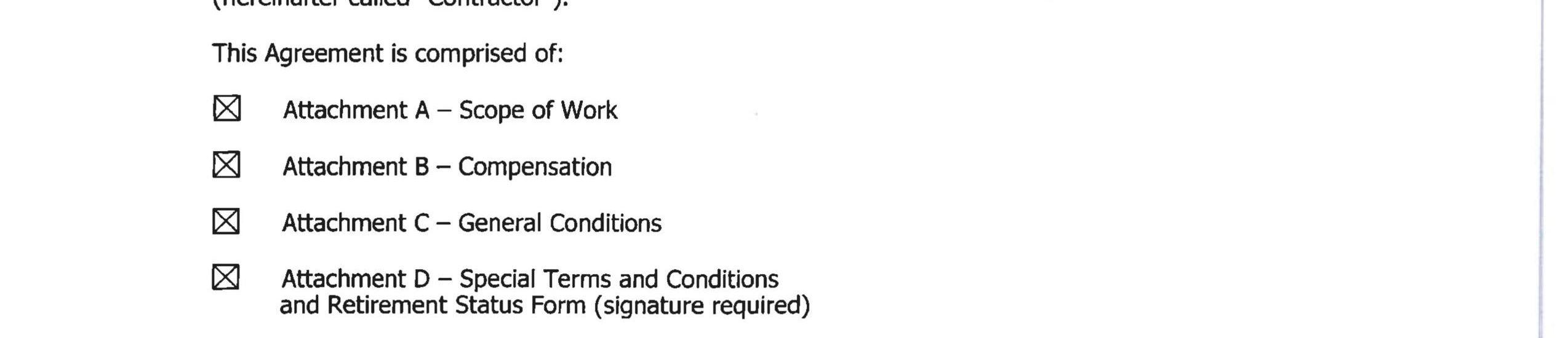 WHEREAS, pursuant to Article 8 “Modifications” of Attachment C to the Agreement, the parties wish to amend the Agreement to modify the term of the Agreement and compensation payable to Contractor;