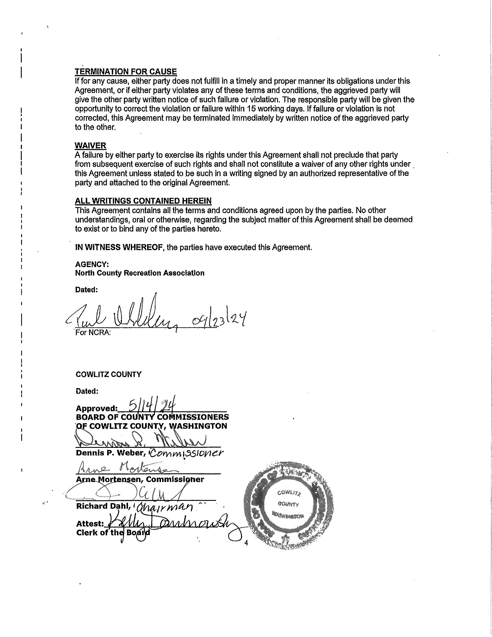 5. Amendment No. 1 to the Agreement with North County Recreation Association for their Event Venue Completion Project to extend the contract to December 31, 2025. (13947)