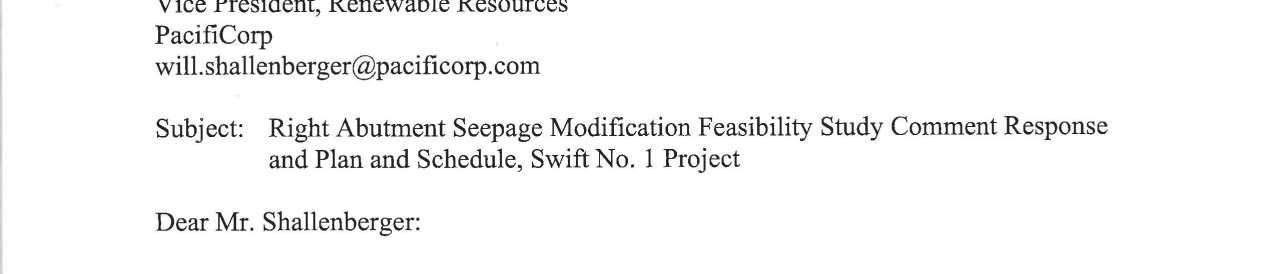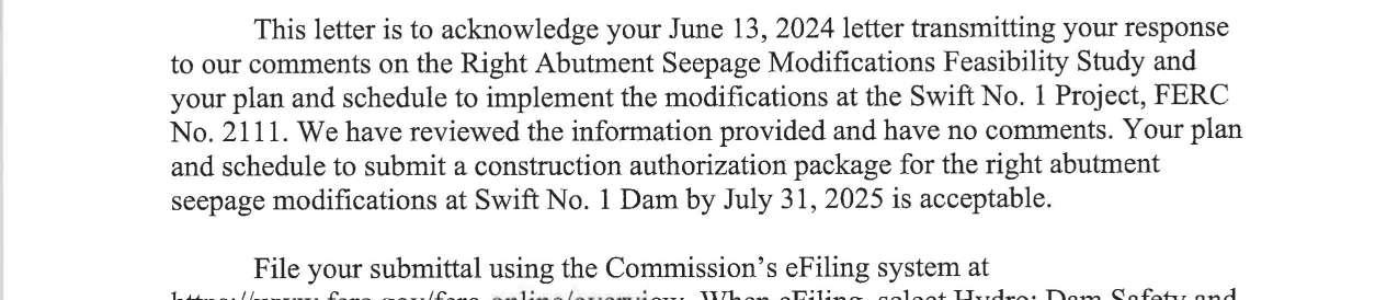 f. Federal Energy Regulatory Commission (FERC) Notice dated 9/16/2024 regarding the Right Abutment Seepage Modification Feasibility Study Comment Response and Plan and Schedule, Swift No. 1 Project. (13751)