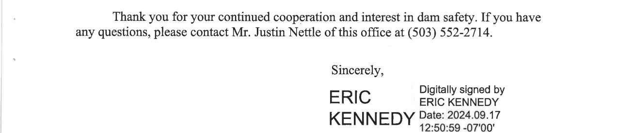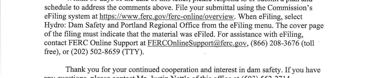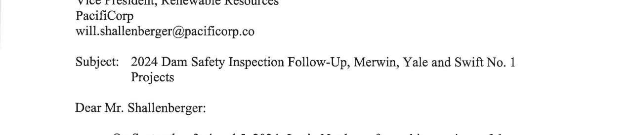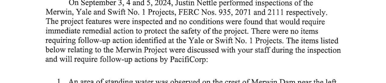 b. Federal Energy Regulatory Commission (FERC) Notice dated 9/11/2024 regarding 2024 Dam Safety Inspection Follow-Up, Merwin, Yale and Swift No. 1 Projects. (13747)