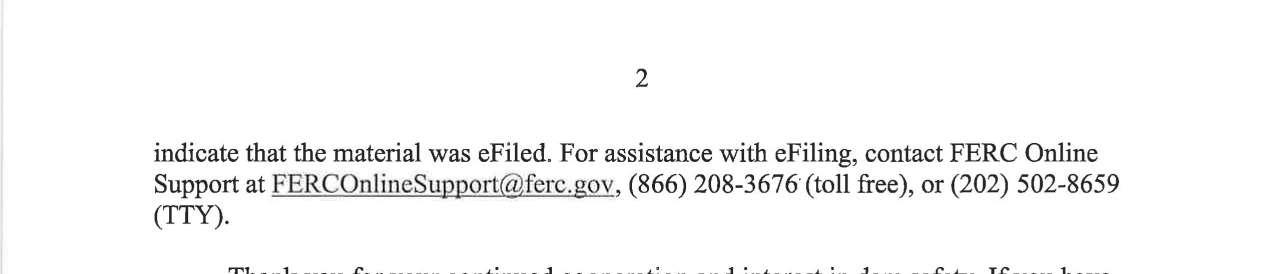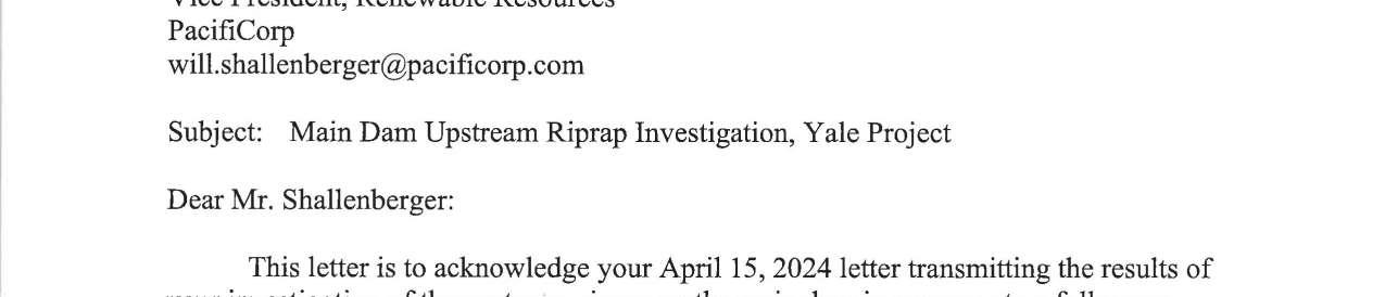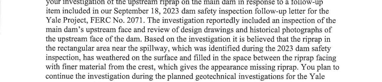 e. Federal Energy Regulatory Commission (FERC) Notice dated 9/16/24 regarding the Main Dam Upstream Riprap Investigation, Yale Project. (13750)
