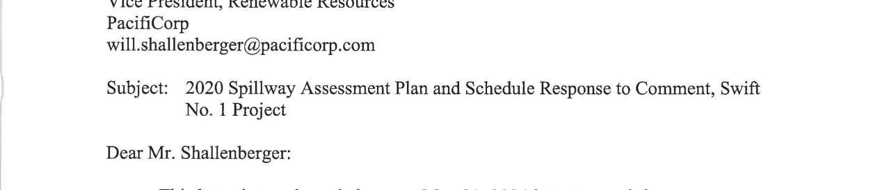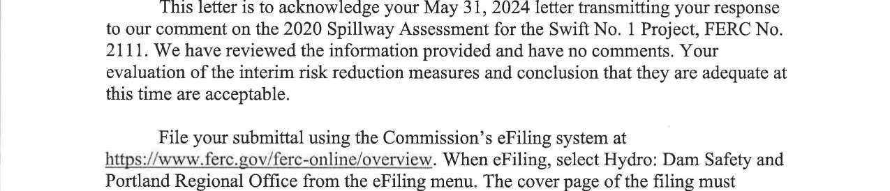 c. Federal Energy Regulatory Commission (FERC) Notice dated 9/16/2024 regarding 2020 Spillway Assessment Plan and Schedule Response to Comment, Swift No. 1 Project. (13748)