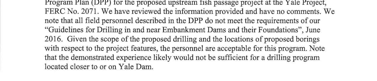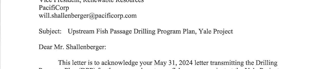 g. Federal Energy Regulatory Commission (FERC) Notice dated 9/17/2024 regarding the Upstream Fish Passage Drilling Program Plan, Yale Project. (13752)