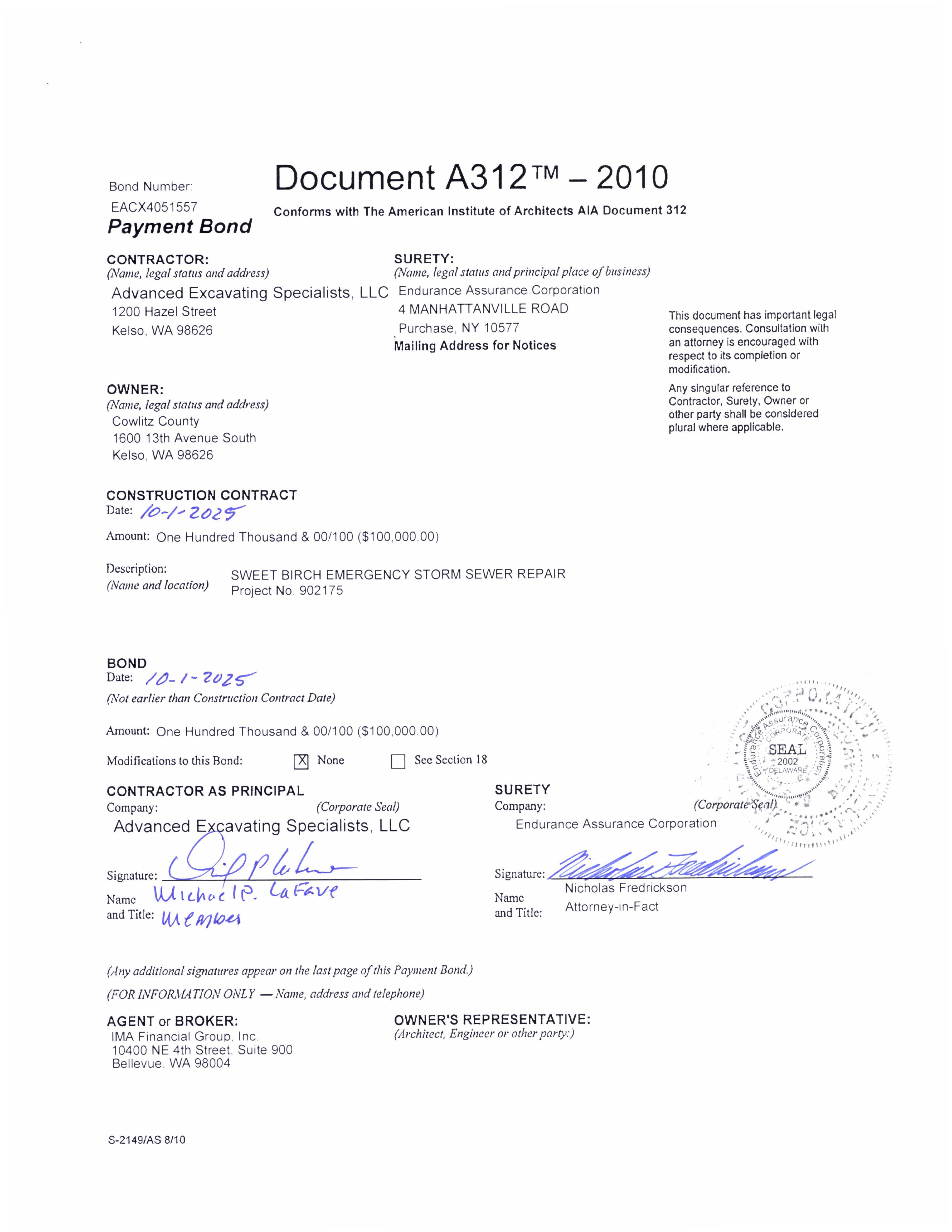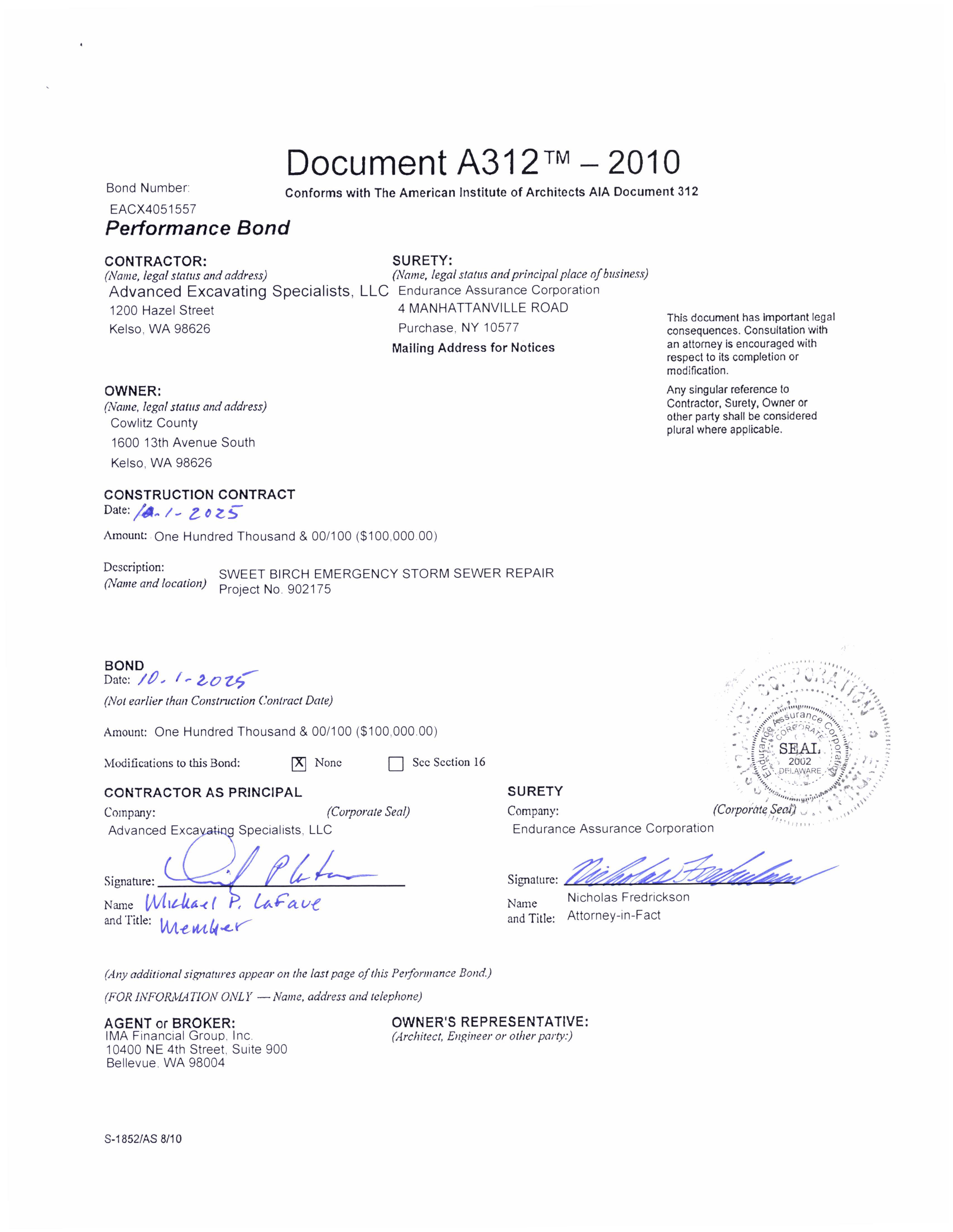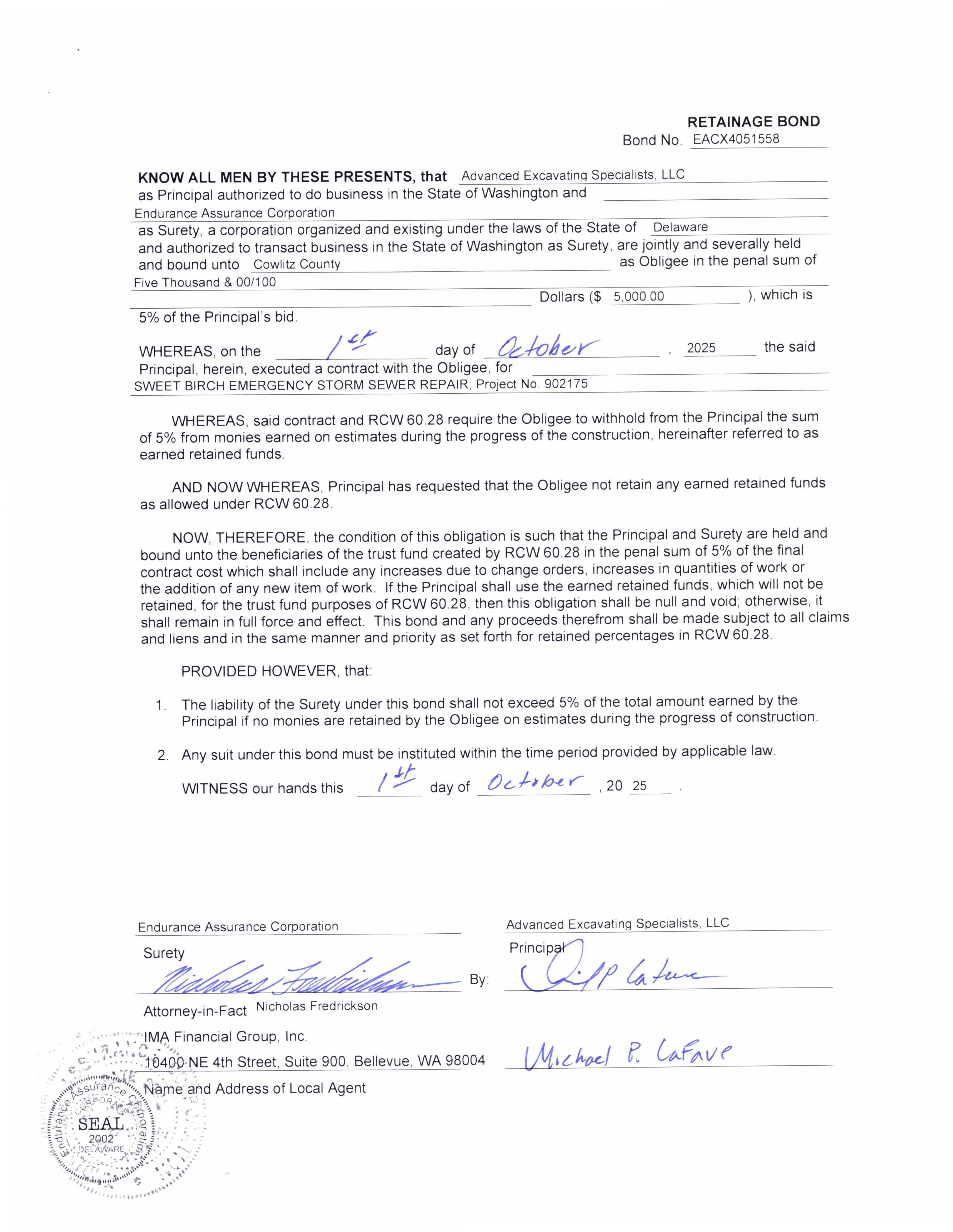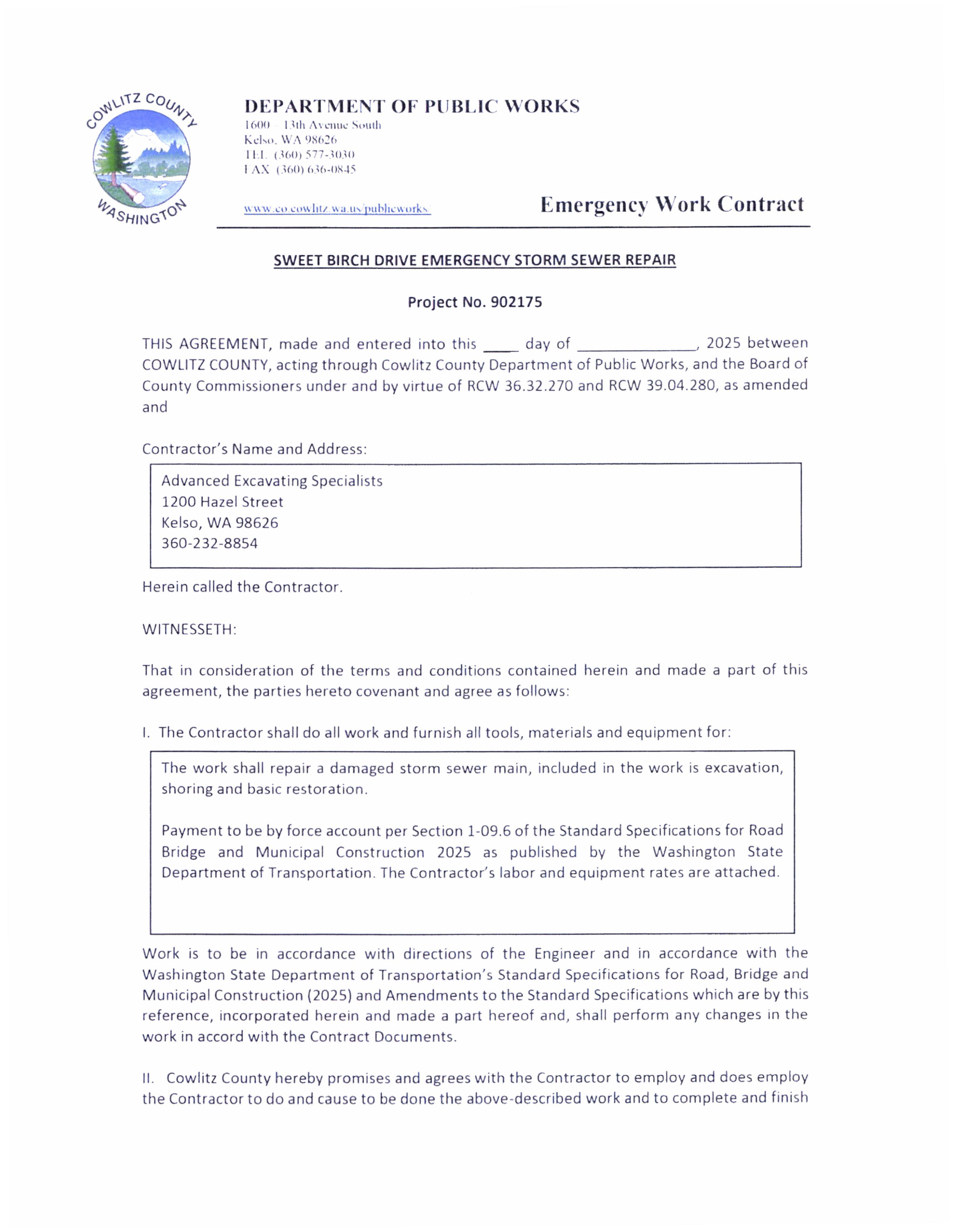 7. Contract and a Bond in Lieu of Retainage with Advanced Excavating Specialists, LLC for an Emergency to Repair a Collapsed Storm Drain on Sweet Birch Drive. (14420)
