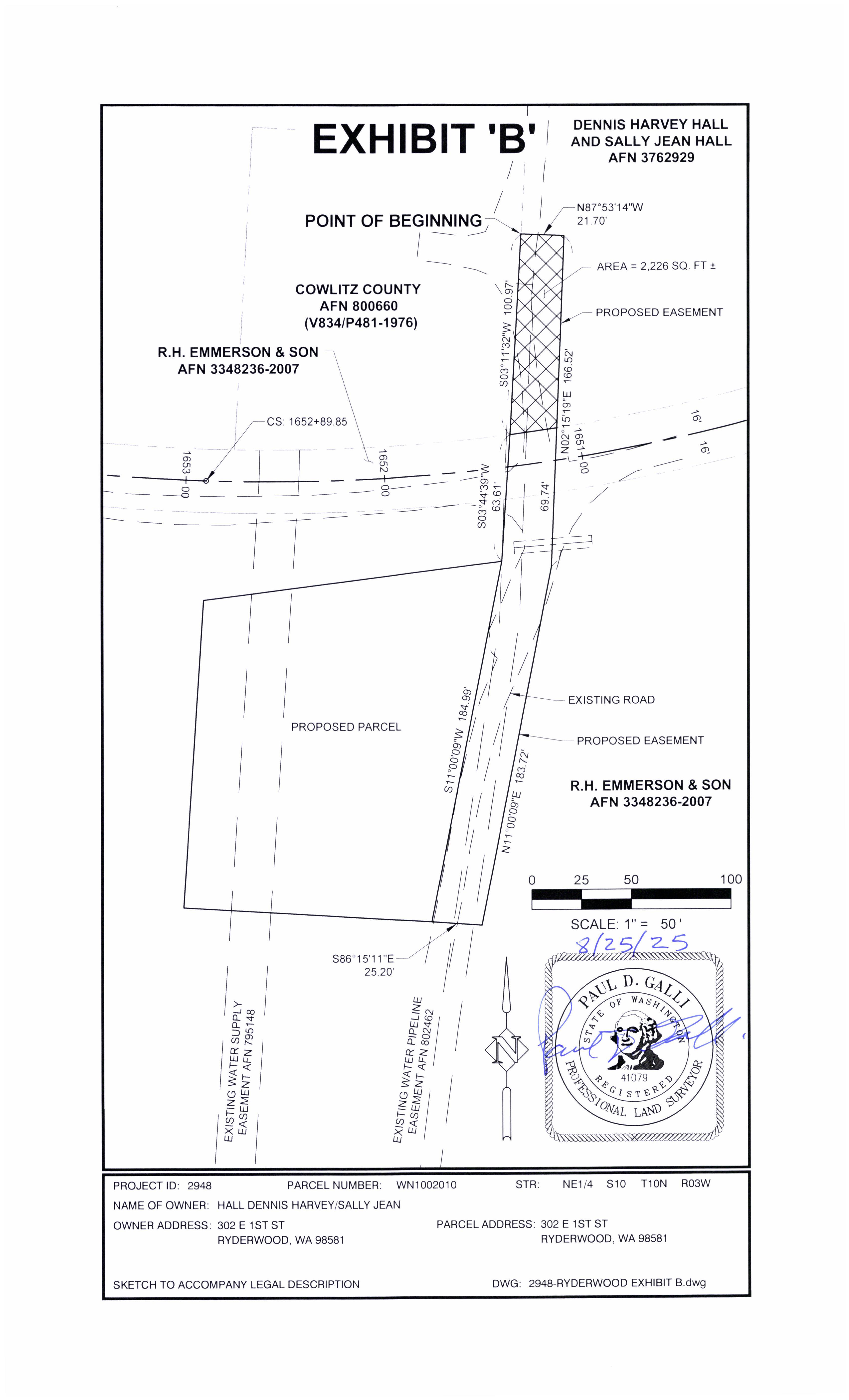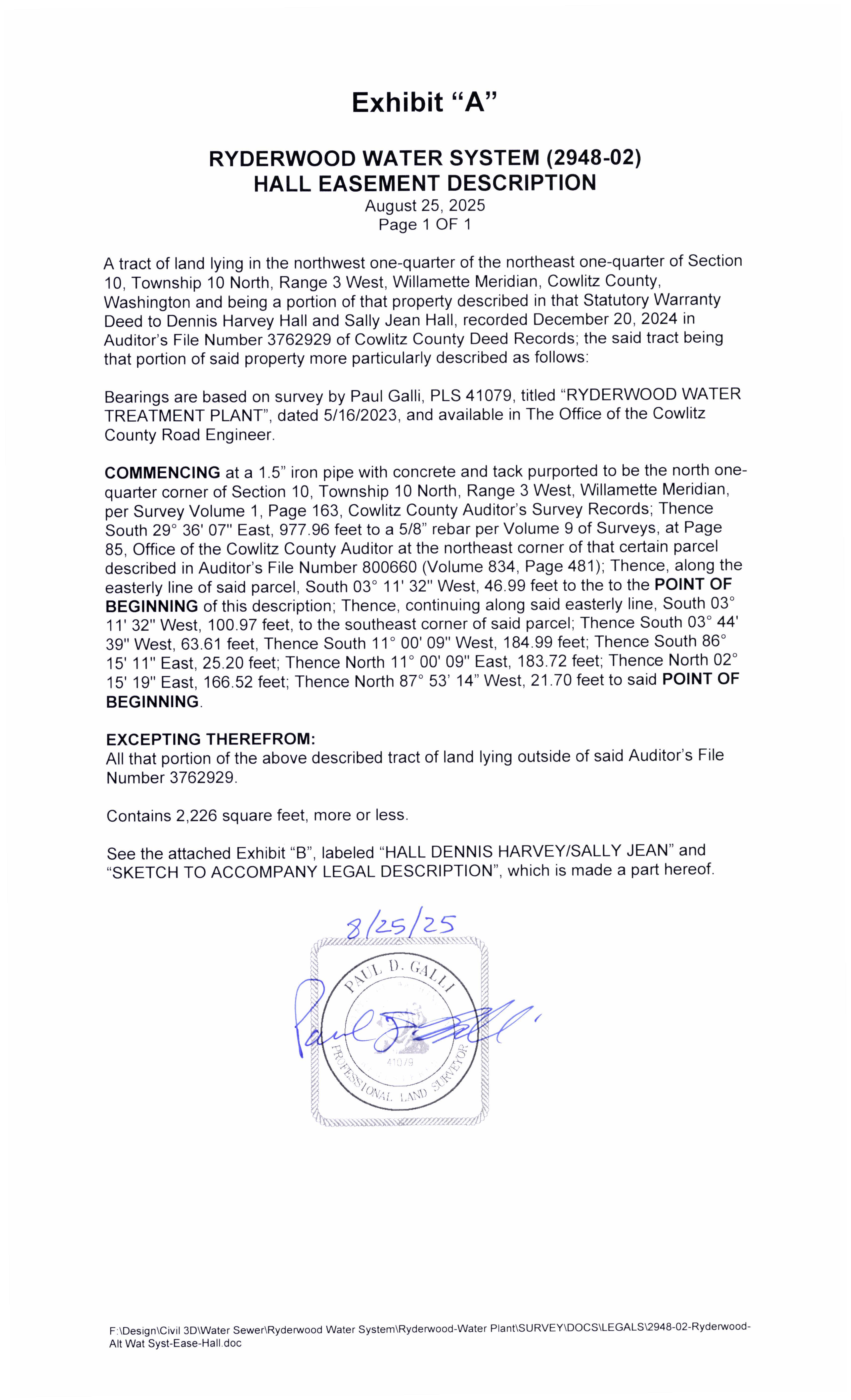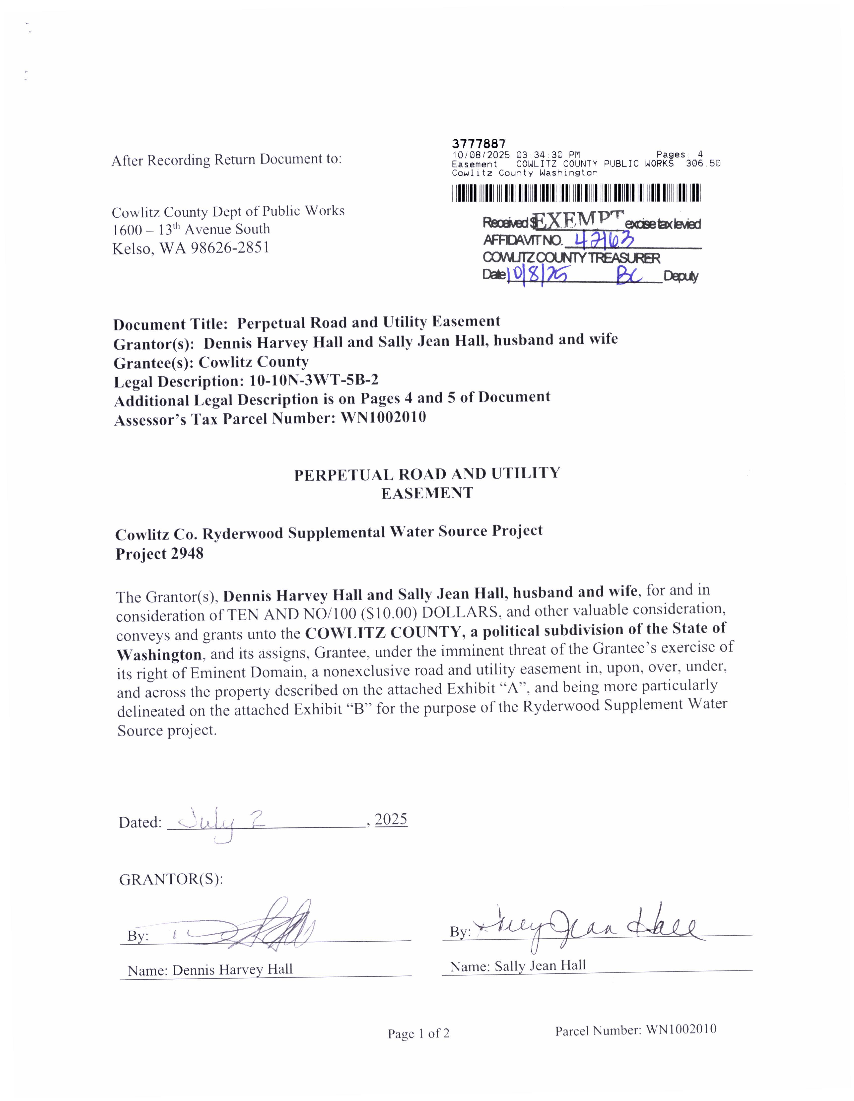 d. Recorded Perpetual Road and Utility Easement from Dennis and Sally Hall for the Ryderwood Supplemental Water Source to address drought resiliency for the residents of Ryderwood, WA. (14426)