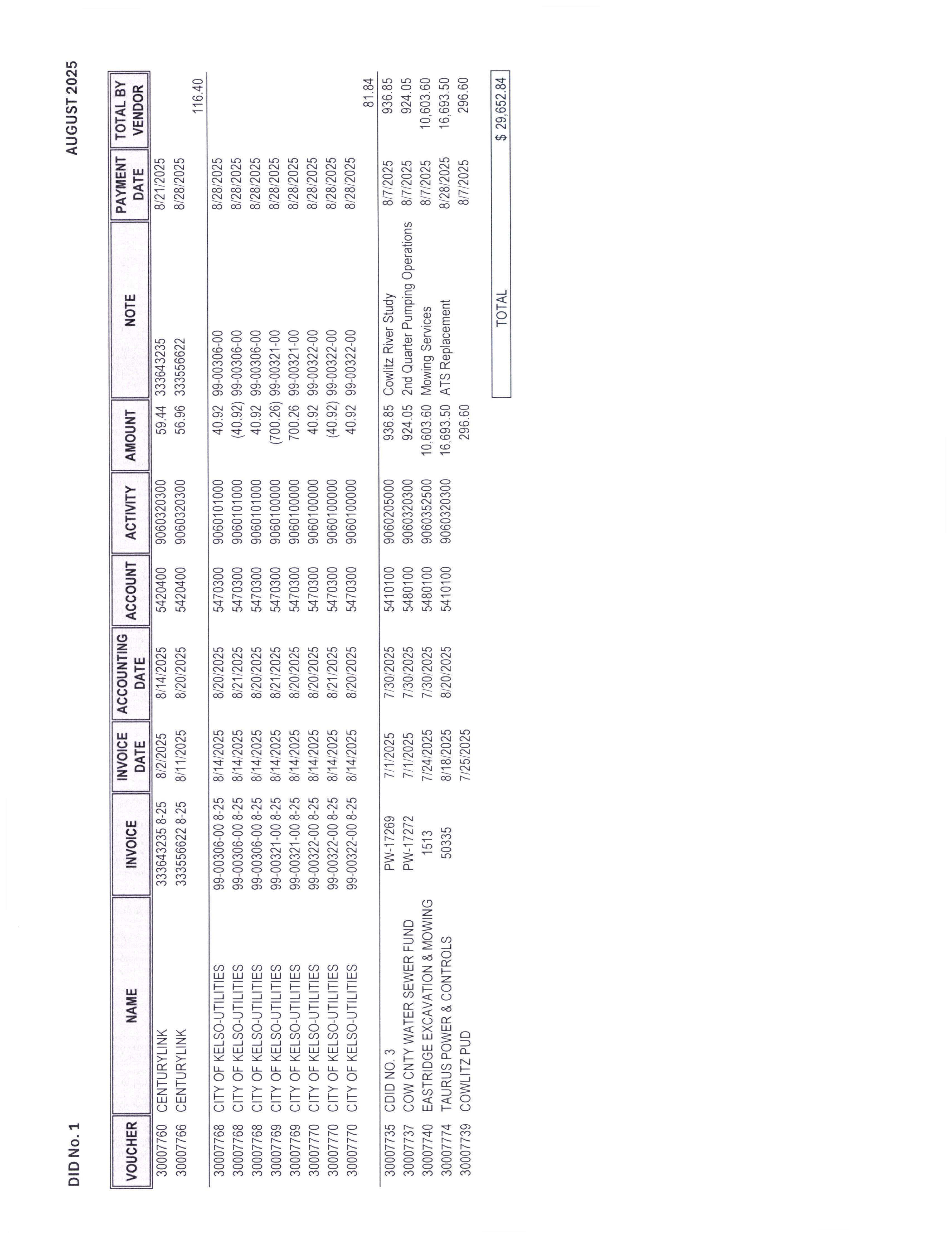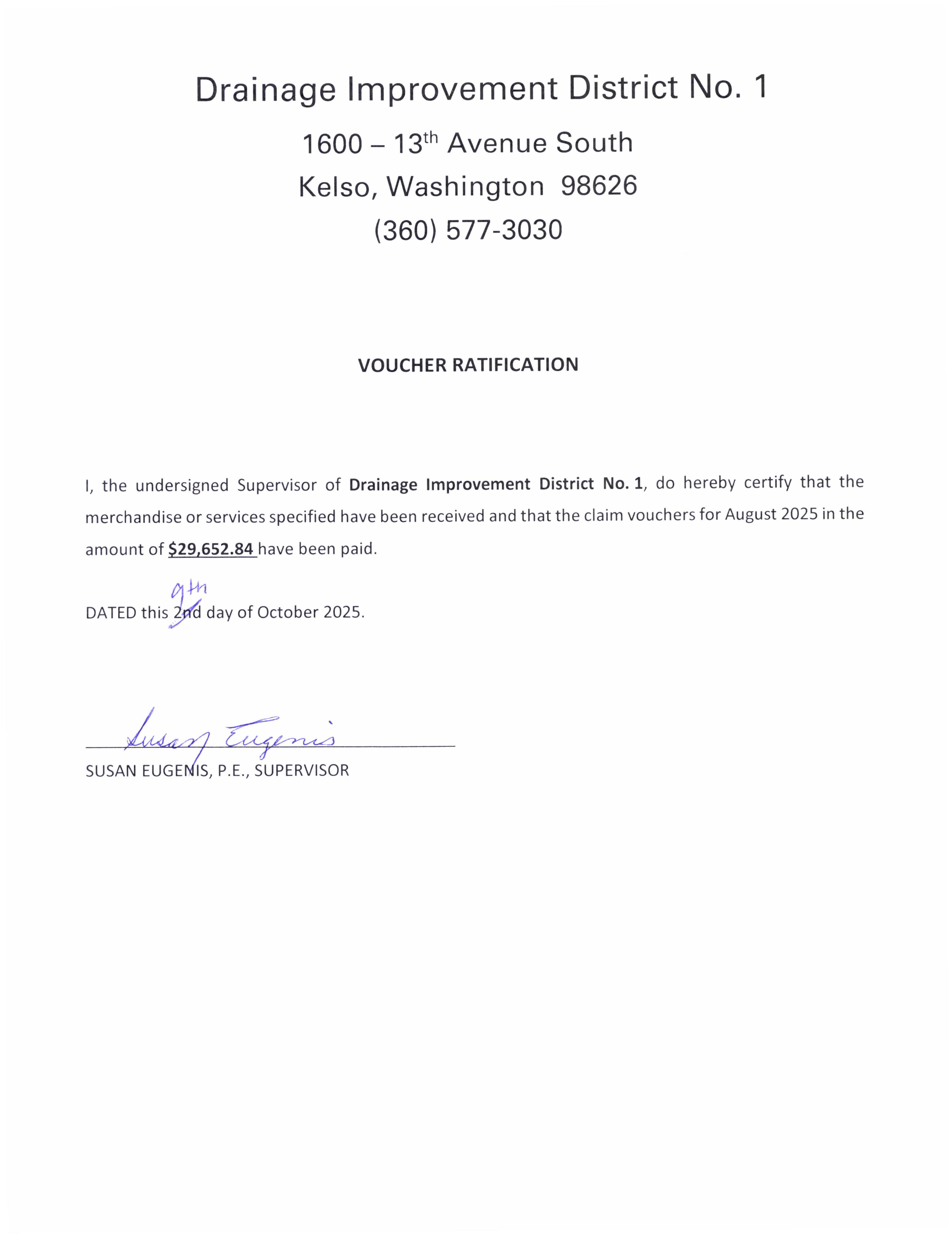 16. Voucher Ratification from the Drainage Improvement District No. 1 for August 2025 in the amount of $29,652.84. (14416)