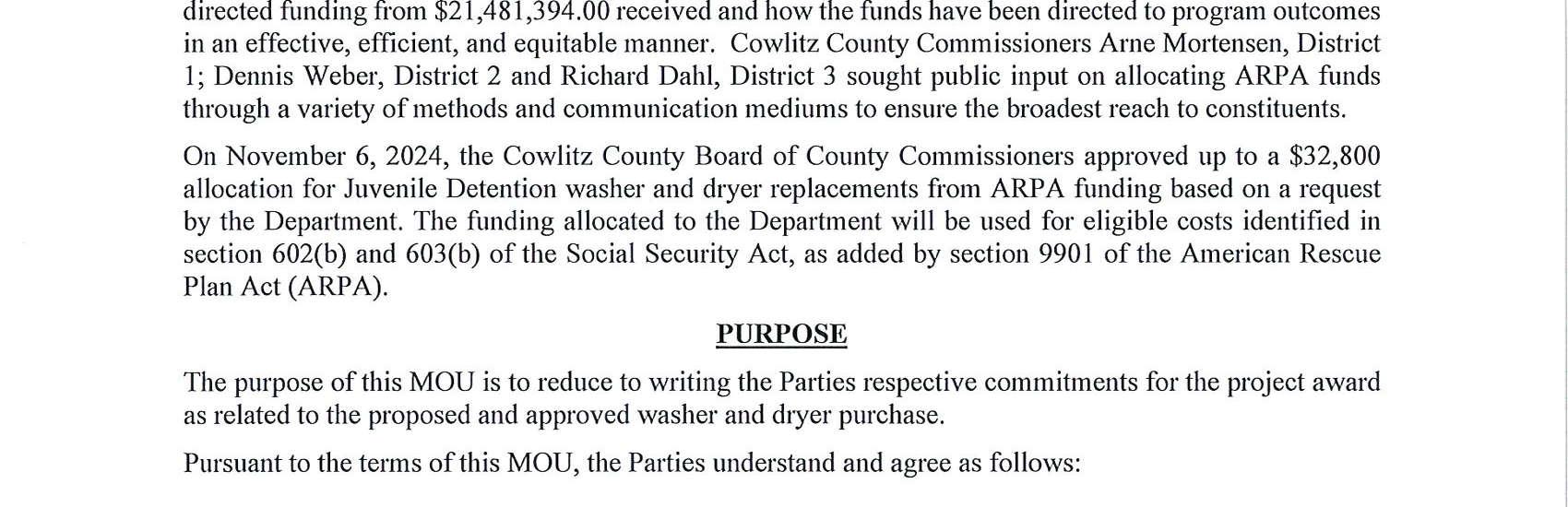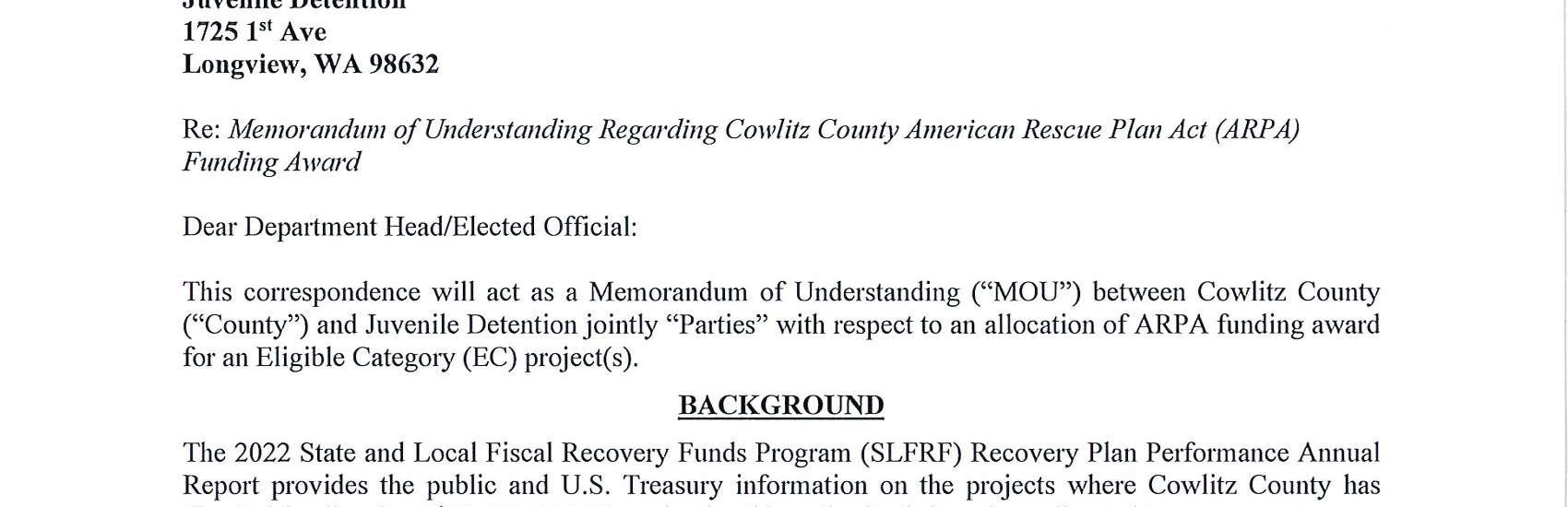 The Board of Cowlitz County Commissioners received requests from Juvenile Detention, Parks and Public Works for American Rescue Plan Act funding. The Board approved the three requests of funding and has agreed to enter into the MOU's with each department to officially allocate the funding.