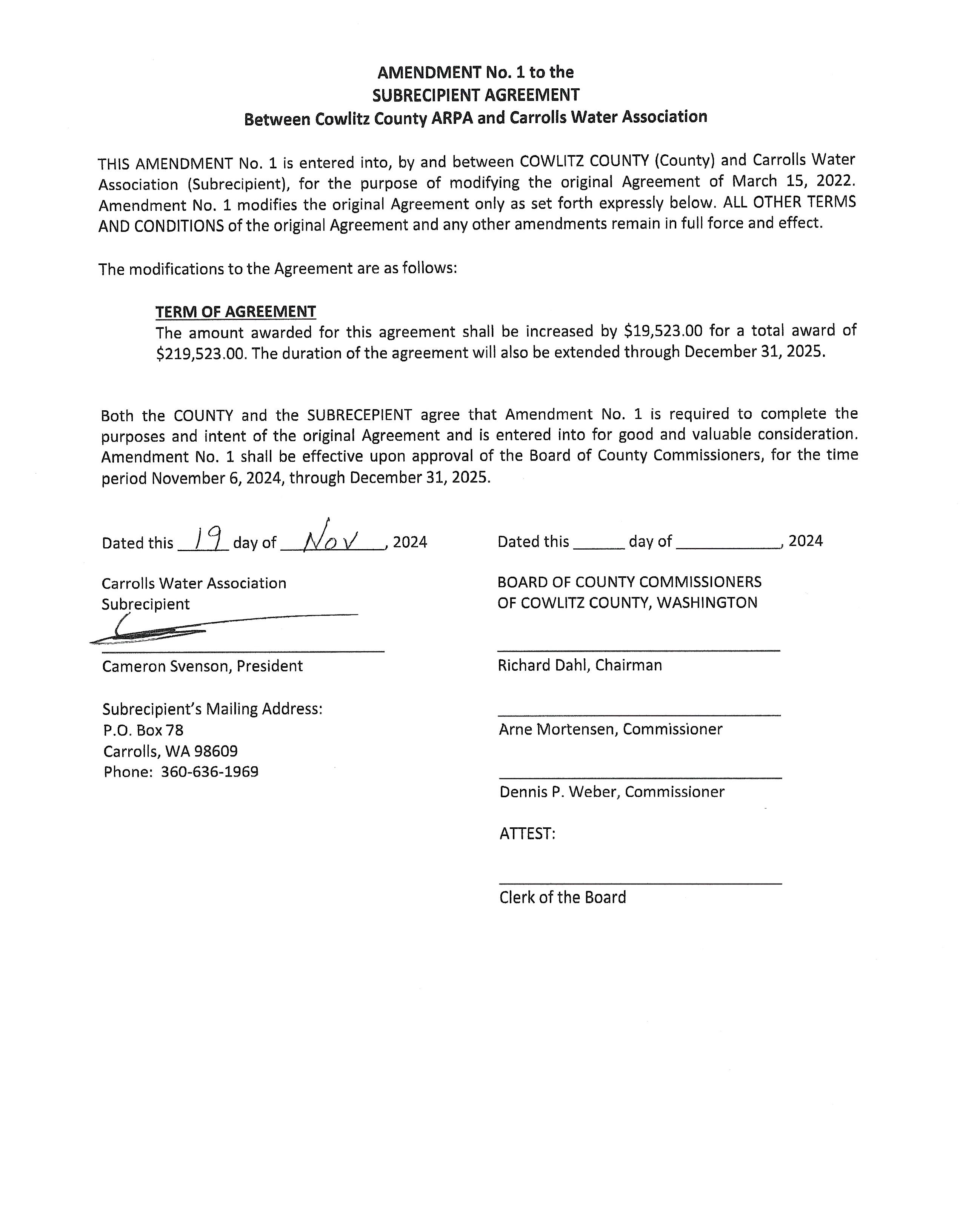 1. Amendment No. 1 to the Subrecipient Agreement with the Carrolls Water Association for additional funding from ARPA direct qualification dollars to complete the project. (13863)