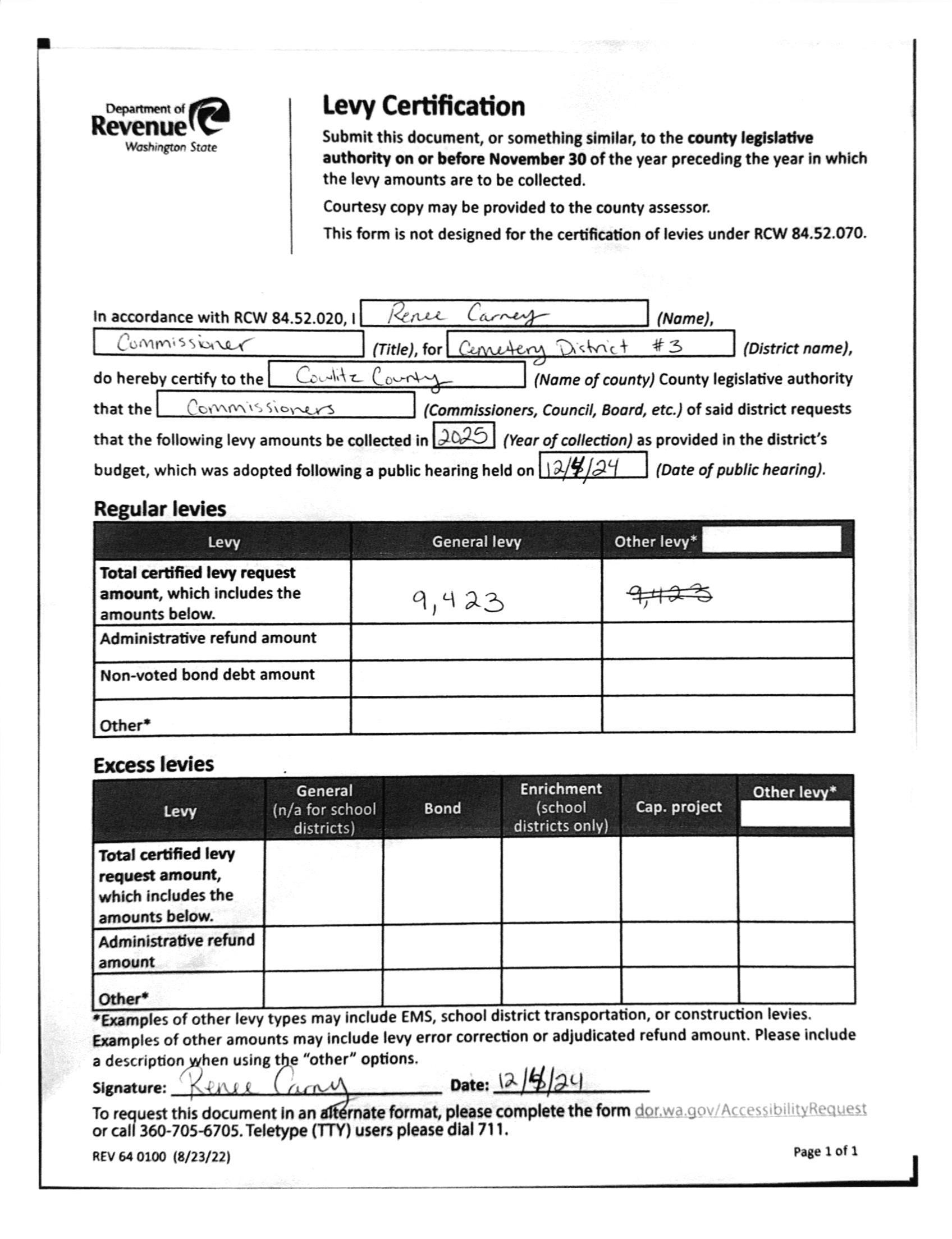 6. Resolution to Certify the Tax Levies for the County and Special Purpose Districts. (13890)