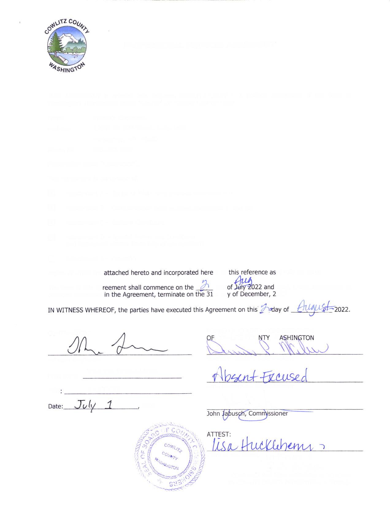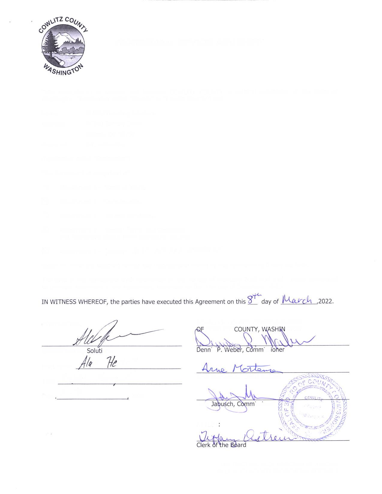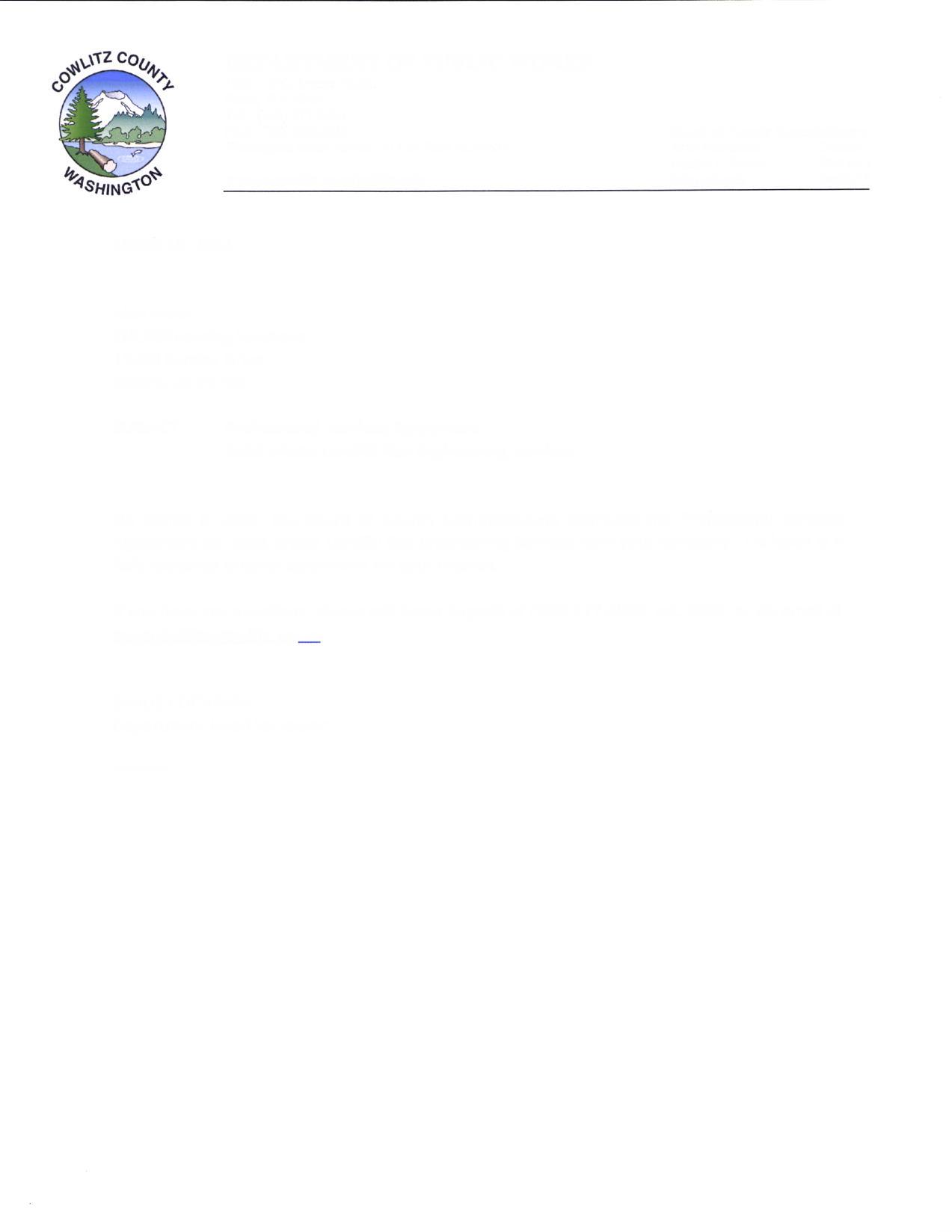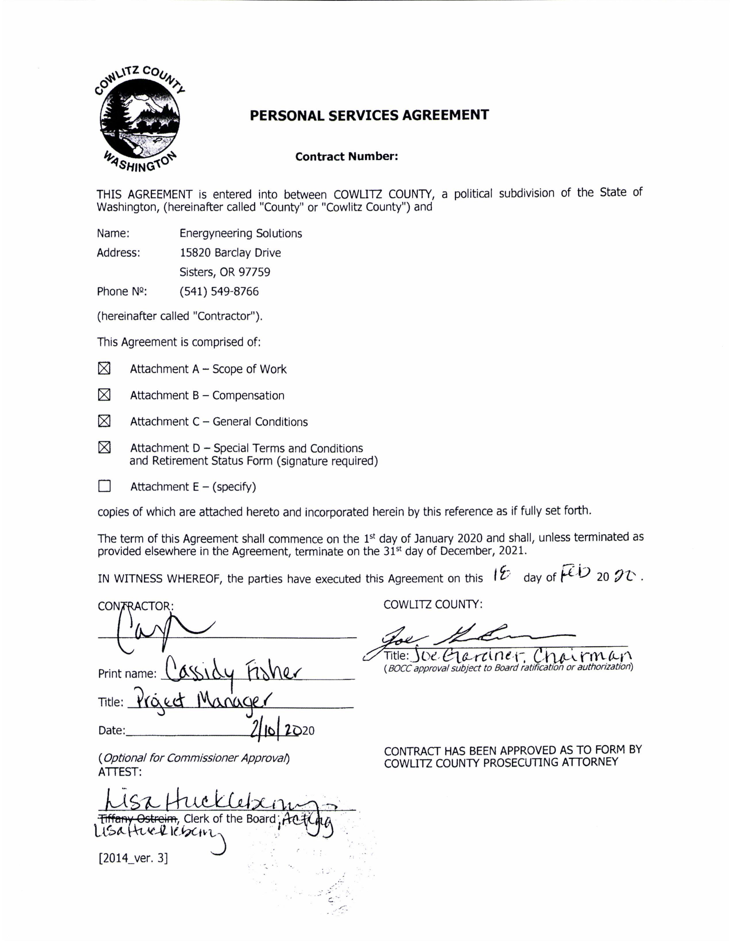 CONTRACT HAS BEEN APPROVED AS TO FORM BY COWLITZ COUNTY , Clerk of the Board