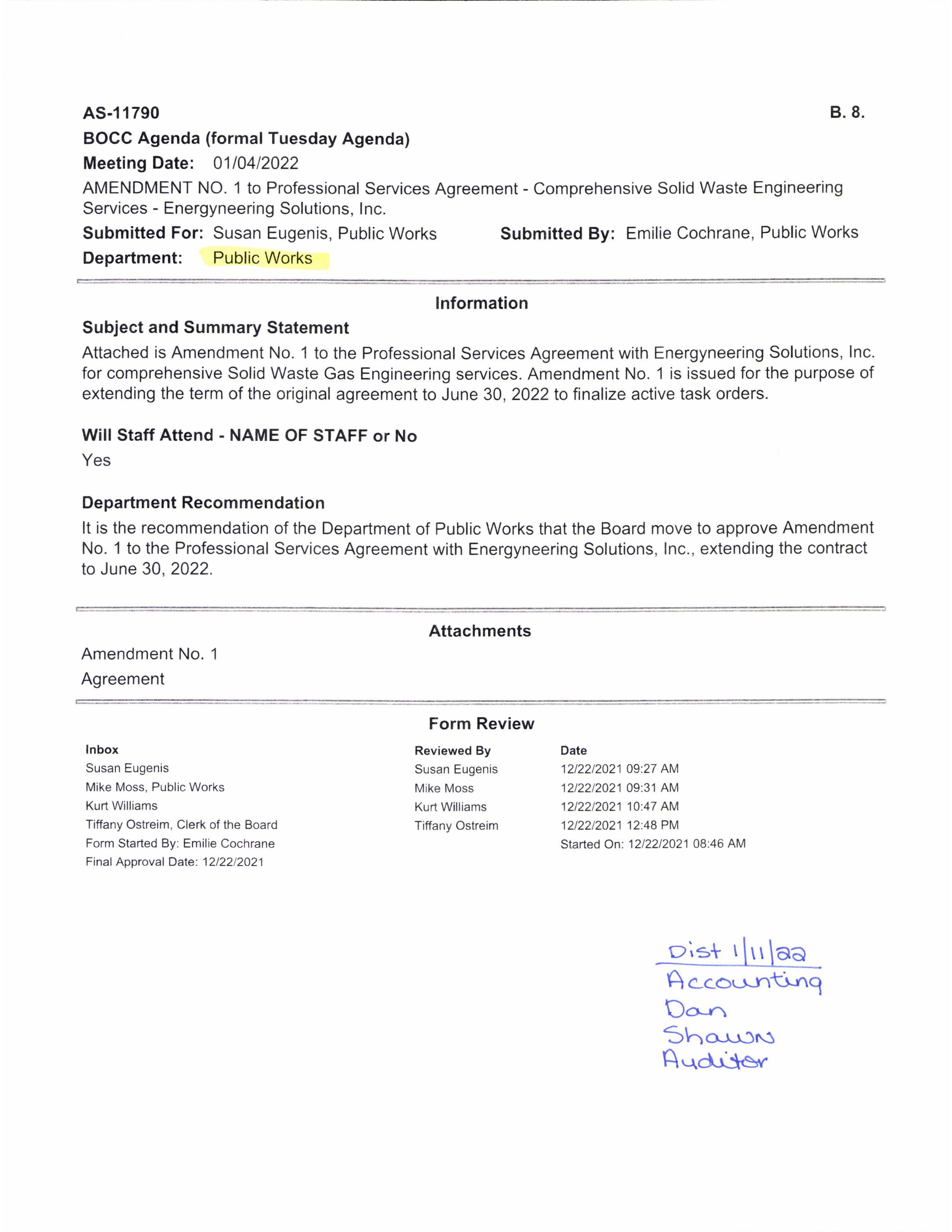 9. Amendment No. 2 to the Professional Services Agreement with Energyneering Solutions, LLC, for as-needed landfill gas engineering services to increase the maximum amount payable to from $250,000 to $350,000 and extend the date to December 31, 2025. (13889)