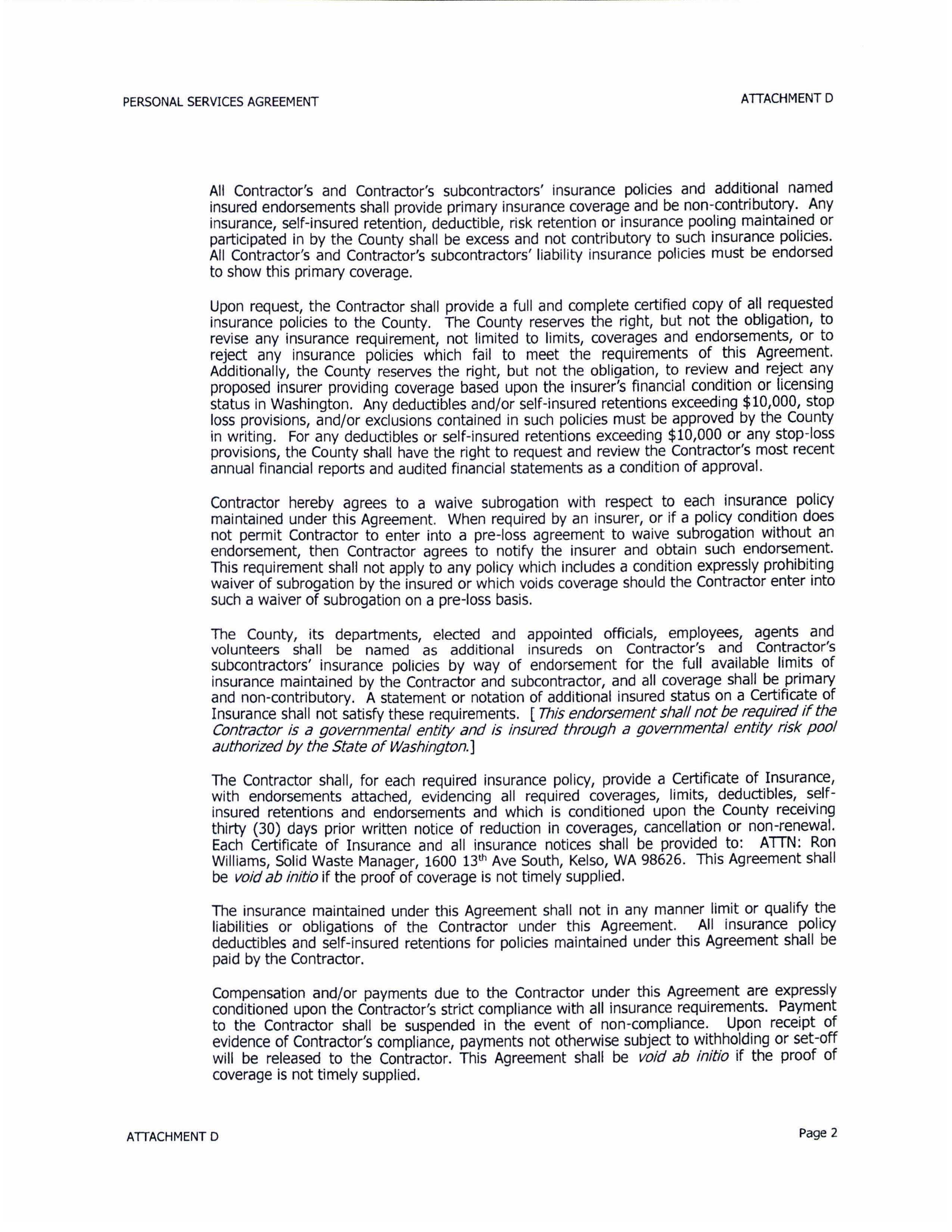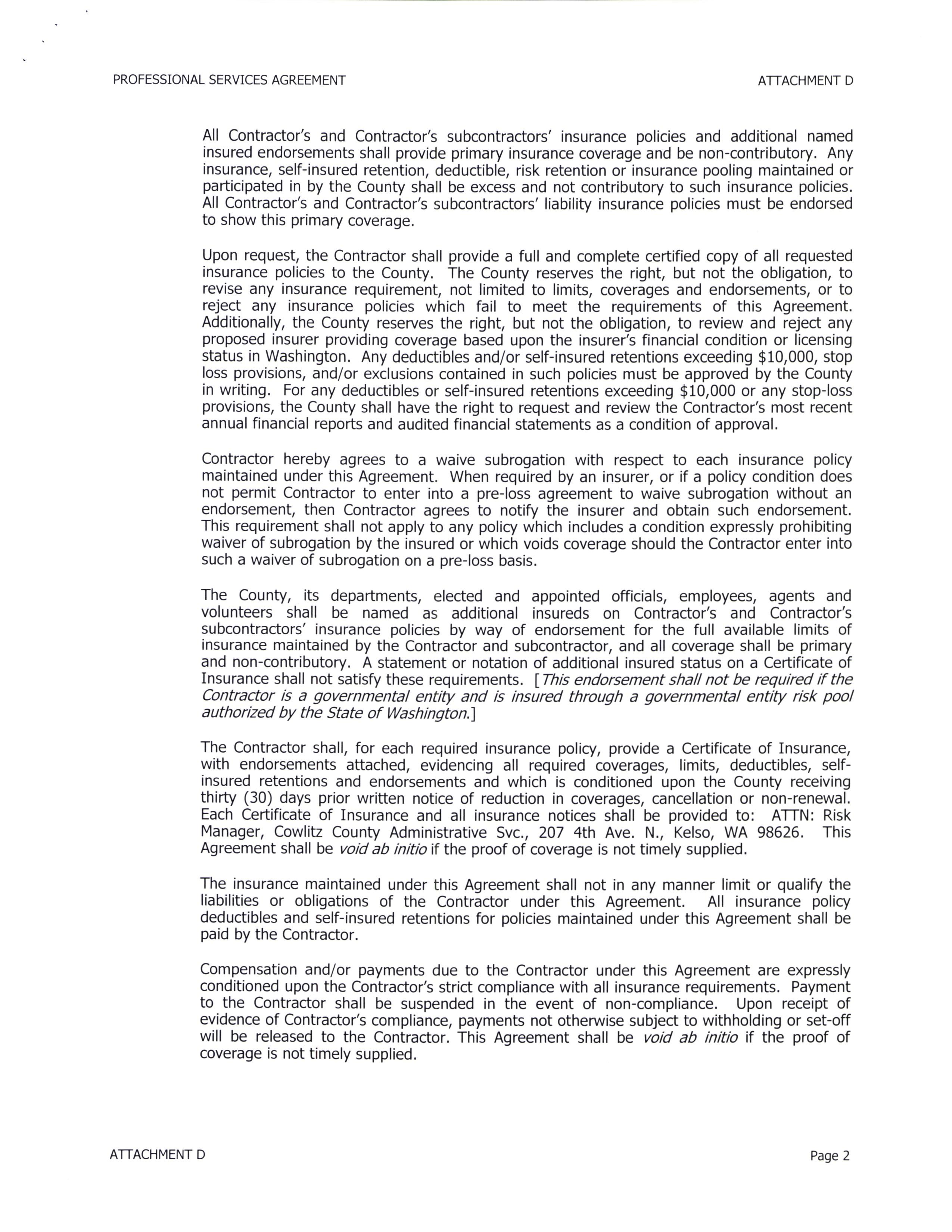 The Subrecipient shall, for each required insurance policy, provide a Certificate of Insurance, with endorsements attached, evidencing all required coverages, limits, deductibles, self-insured retentions and endorsements and which is conditioned upon the County receiving thirty (30) days prior written notice of reduction in coverages, cancellation or non-renewal. Each Certificate of Insurance and all insurance notices shall be provided to: ATTN: County Project Manager, Cowlitz County Health & Human Services, 1952 9th Avenue, Longview, WA 98632. This Agreement shall be void ab initio if the proof of coverage is not timely supplied.