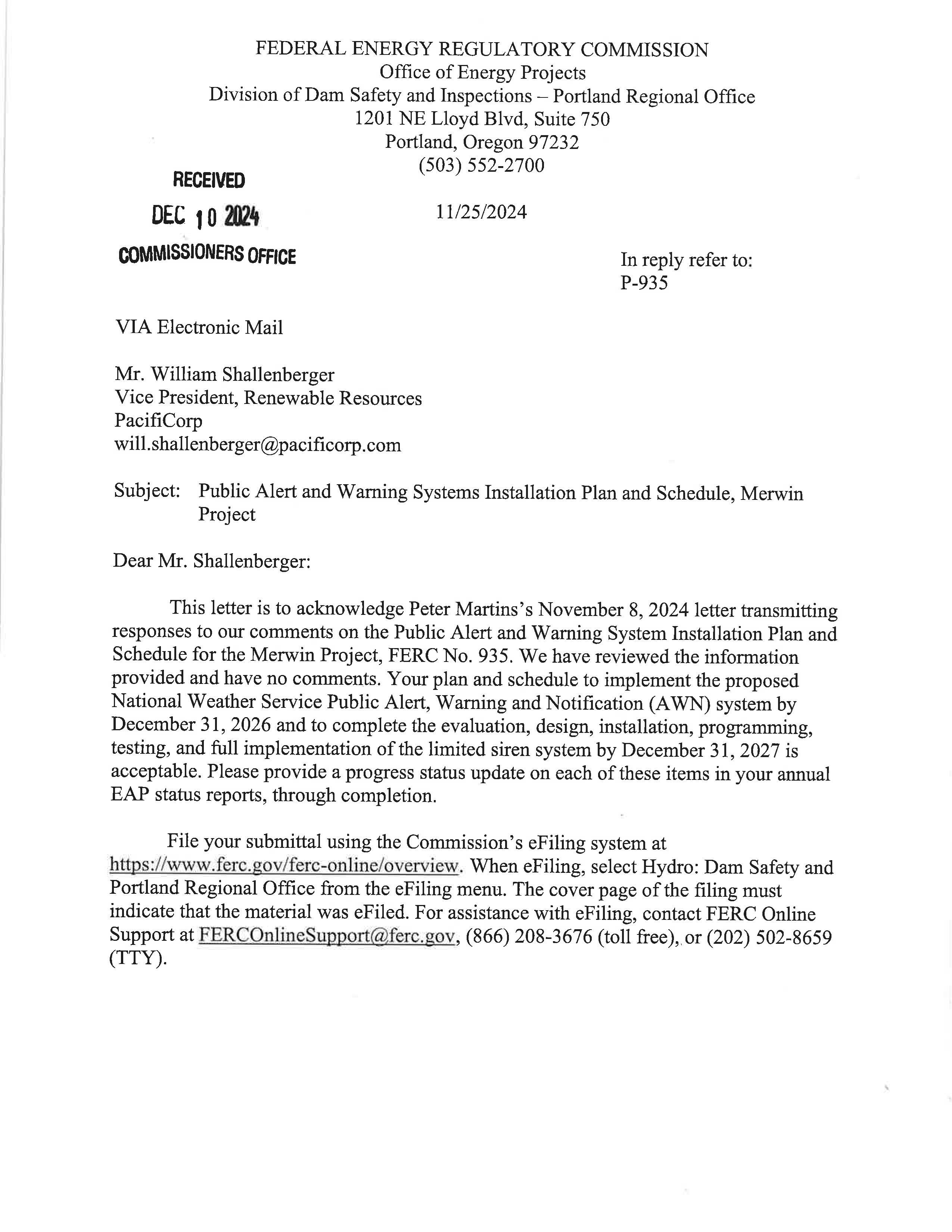 d. Federal Energy Regulatory Commission (FERC) Notice dated 11/25/2024 regarding the Public Alert and Warning Systems Installation Plan and Schedule, Merwin Project. (13904)