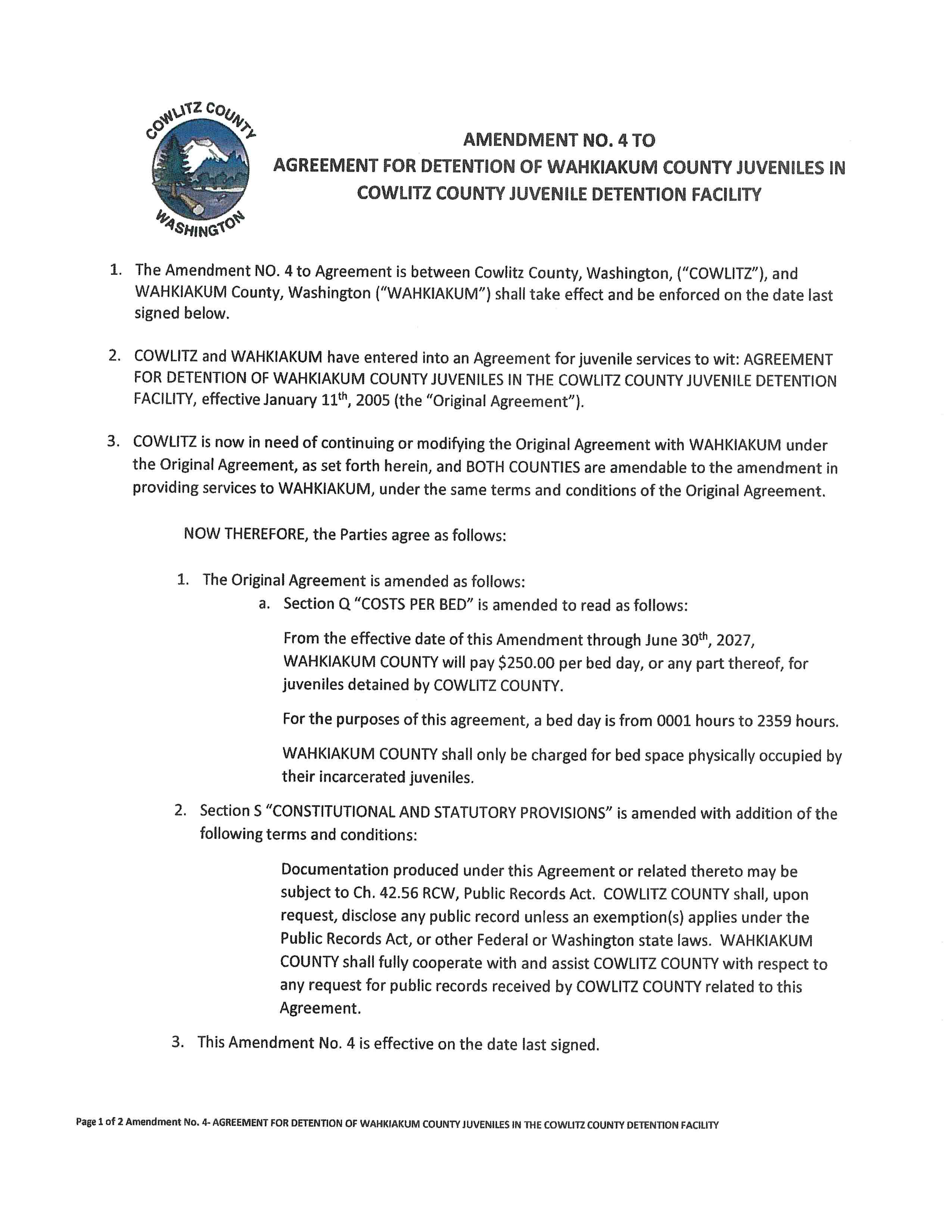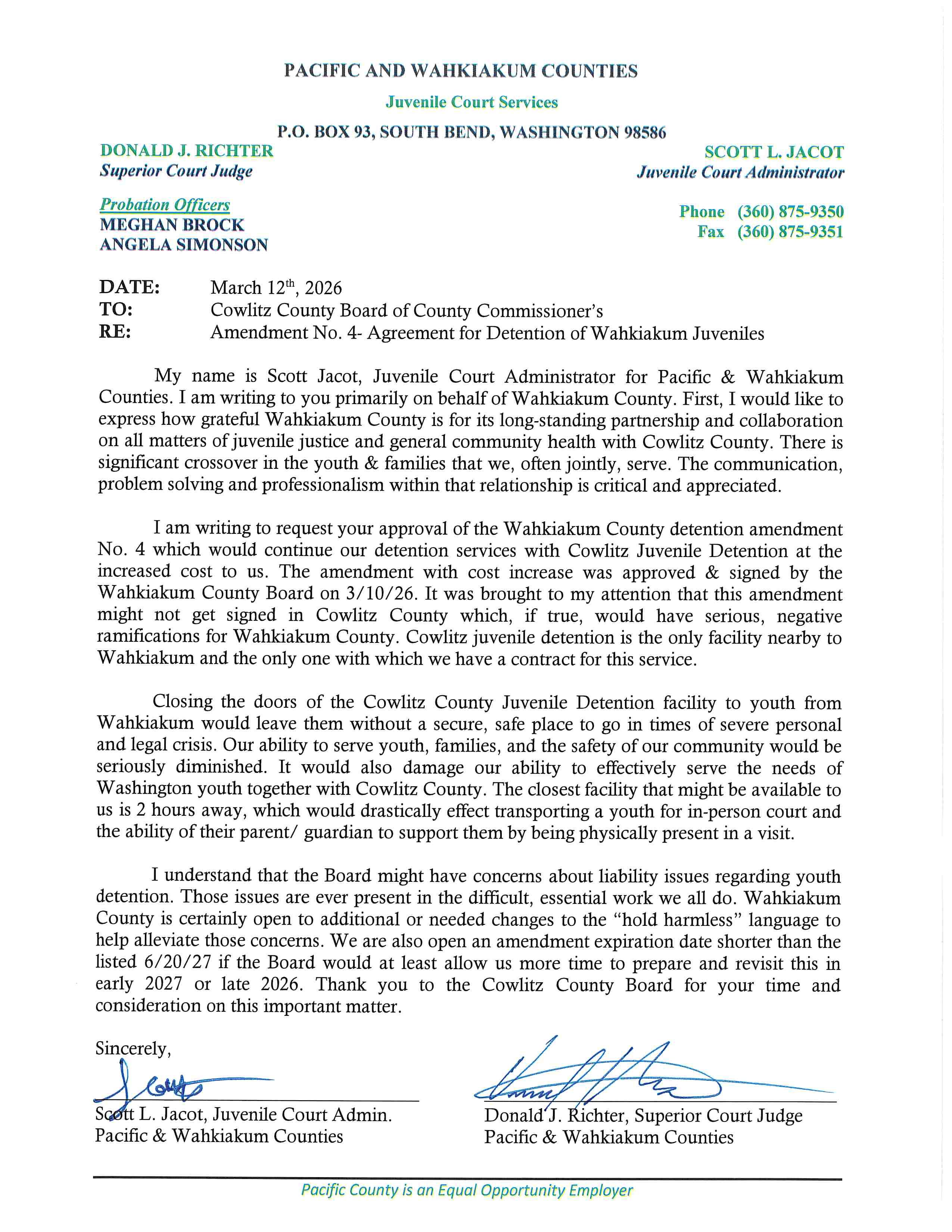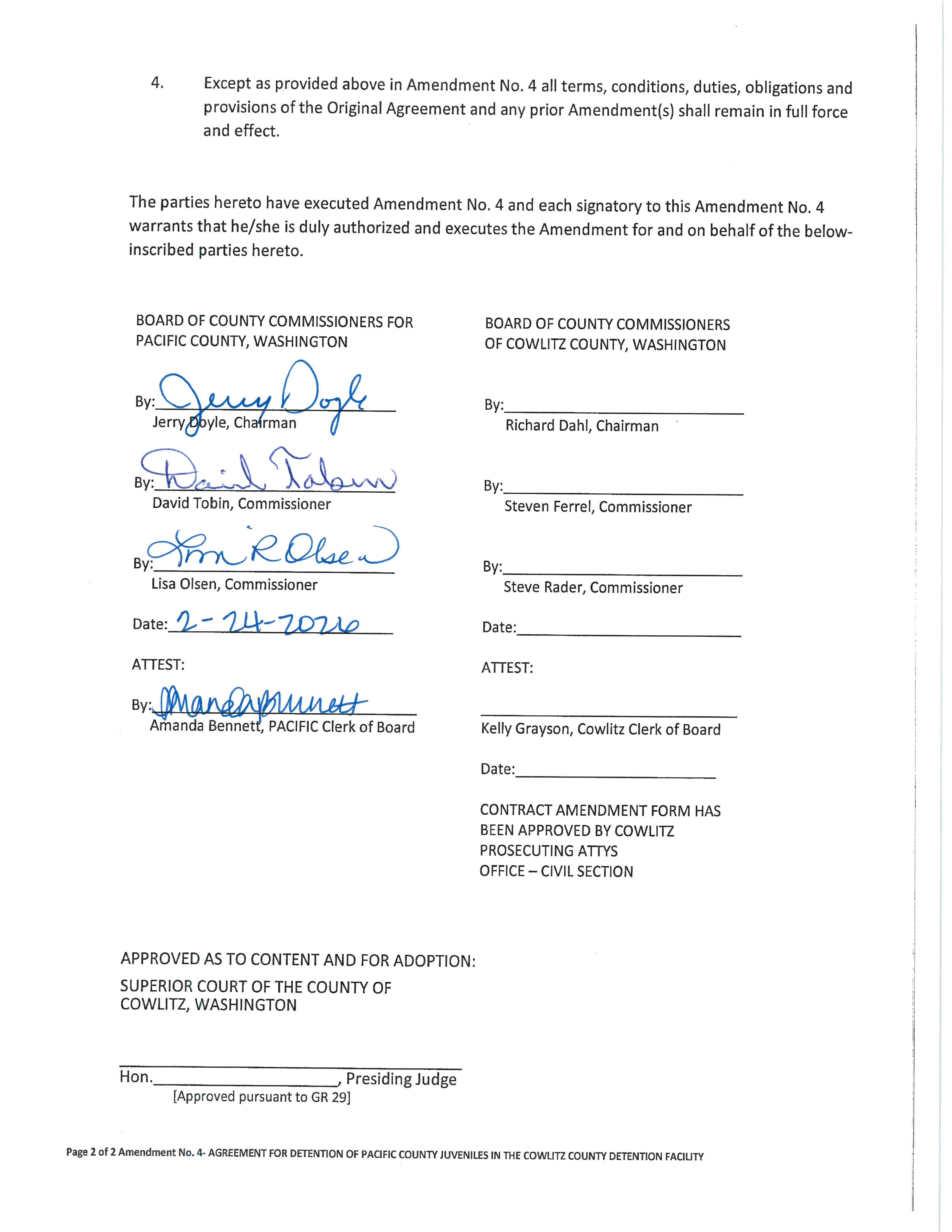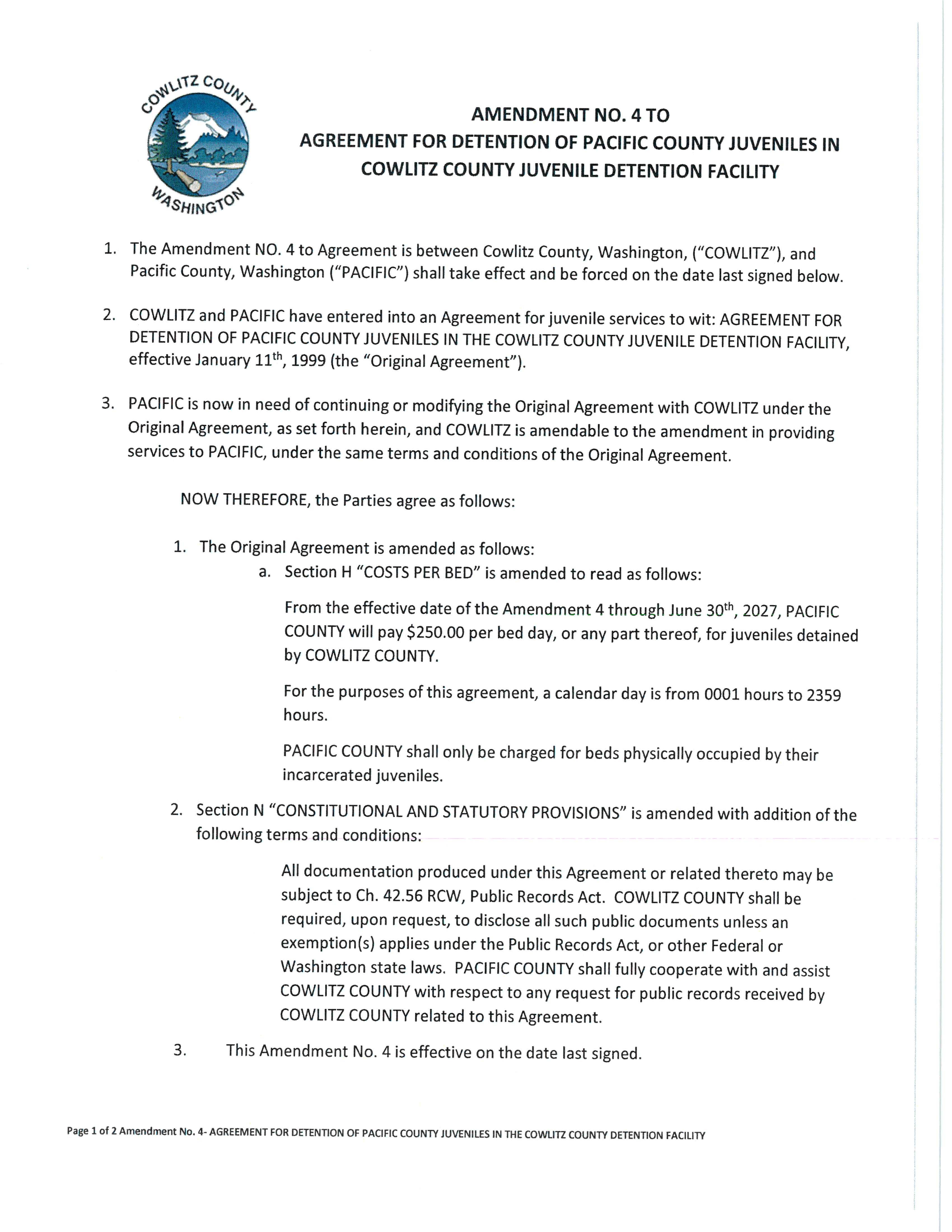 4. Amended Agreement with Pacific County, Washington for Juvenile Detention Services to extend the contract period, increase the bed rate, and add new contract language to reflect current standards. The bed rate is $250 per day. (14776)