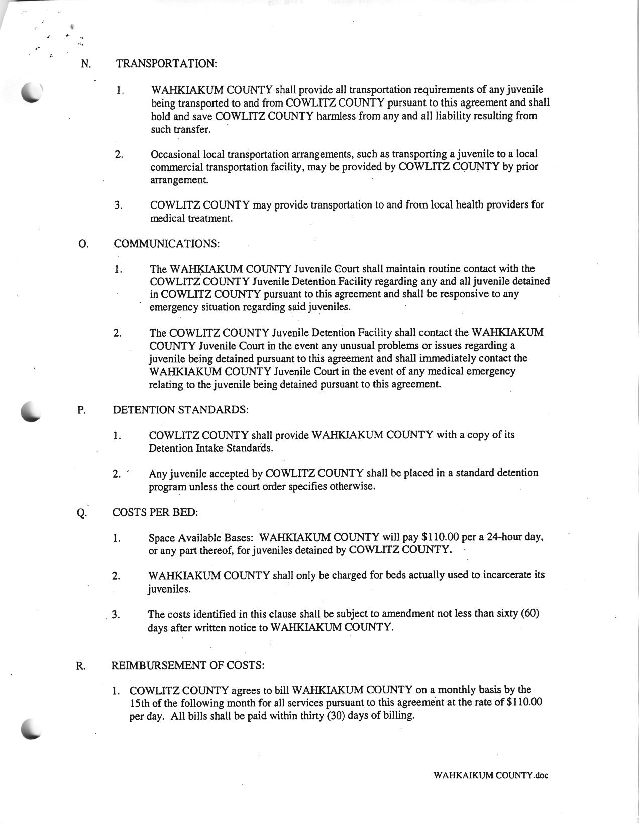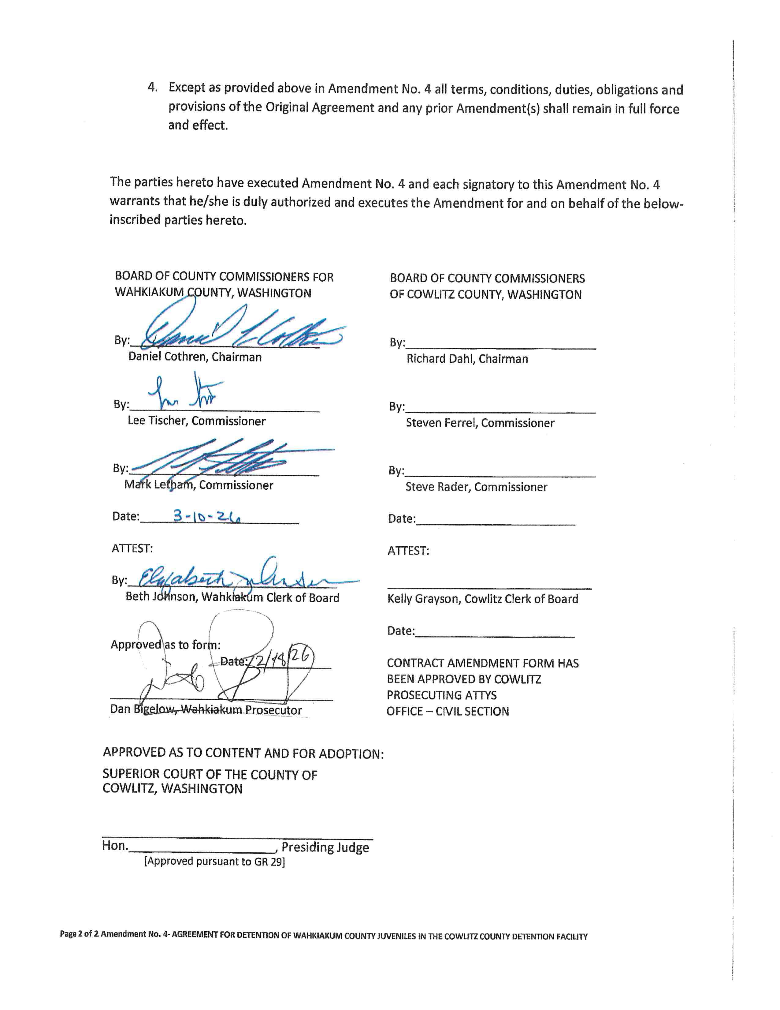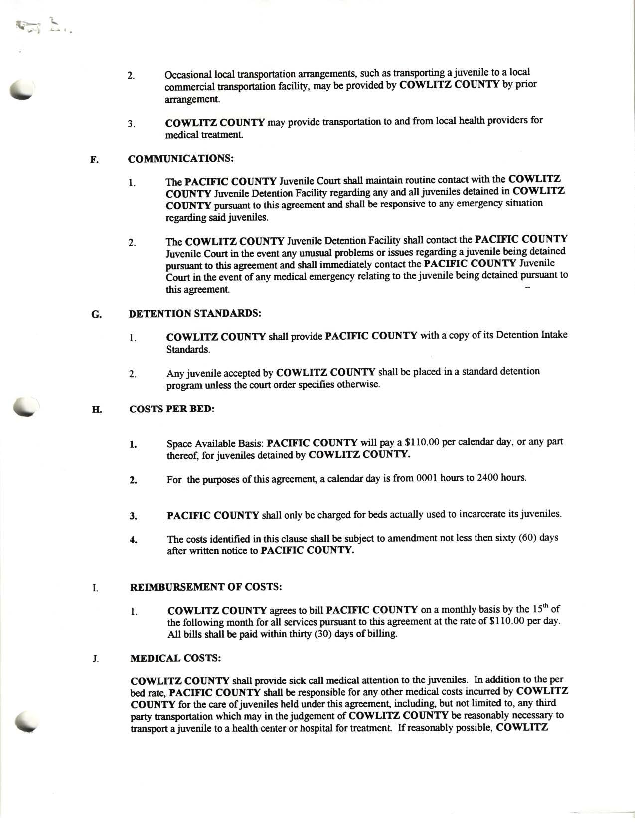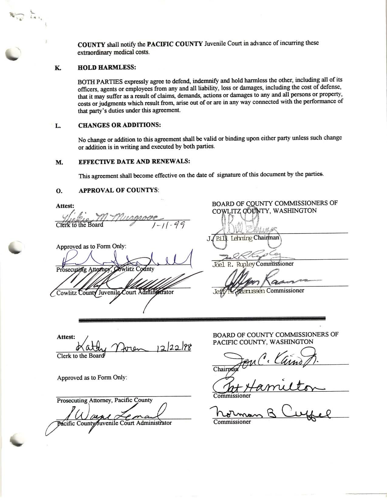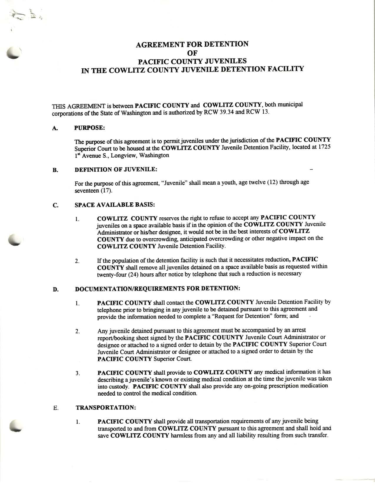 4. Amended Agreement with Pacific County, Washington for Juvenile Detention Services to extend the contract period, increase the bed rate, and add new contract language to reflect current standards. The bed rate is $250 per day. (14776)