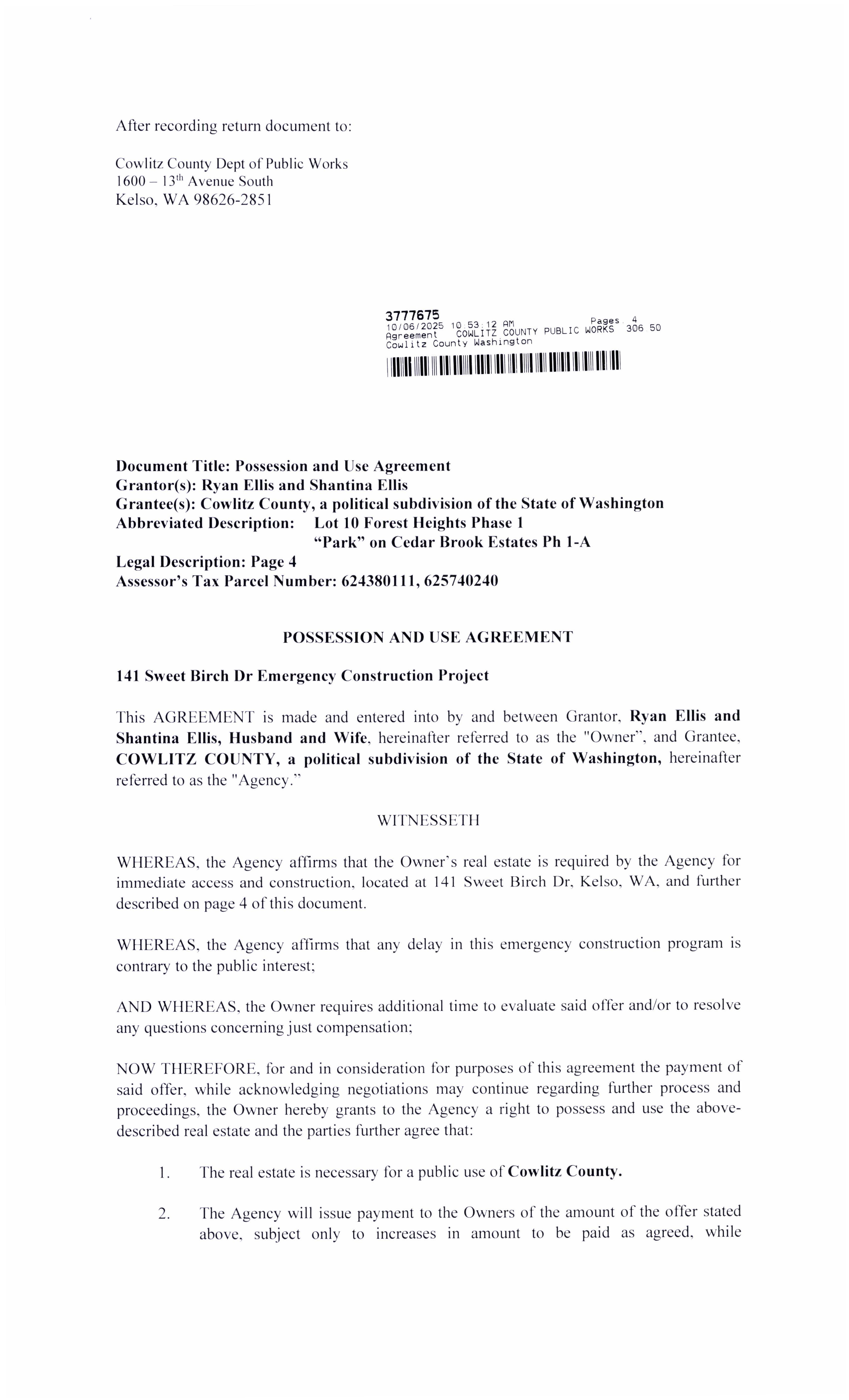 a. Signed and Recorded Rescission of Possession and Use Agreement for the Emergency Repair of the failing Sweet Birch Drive Storm Water System. (14796)